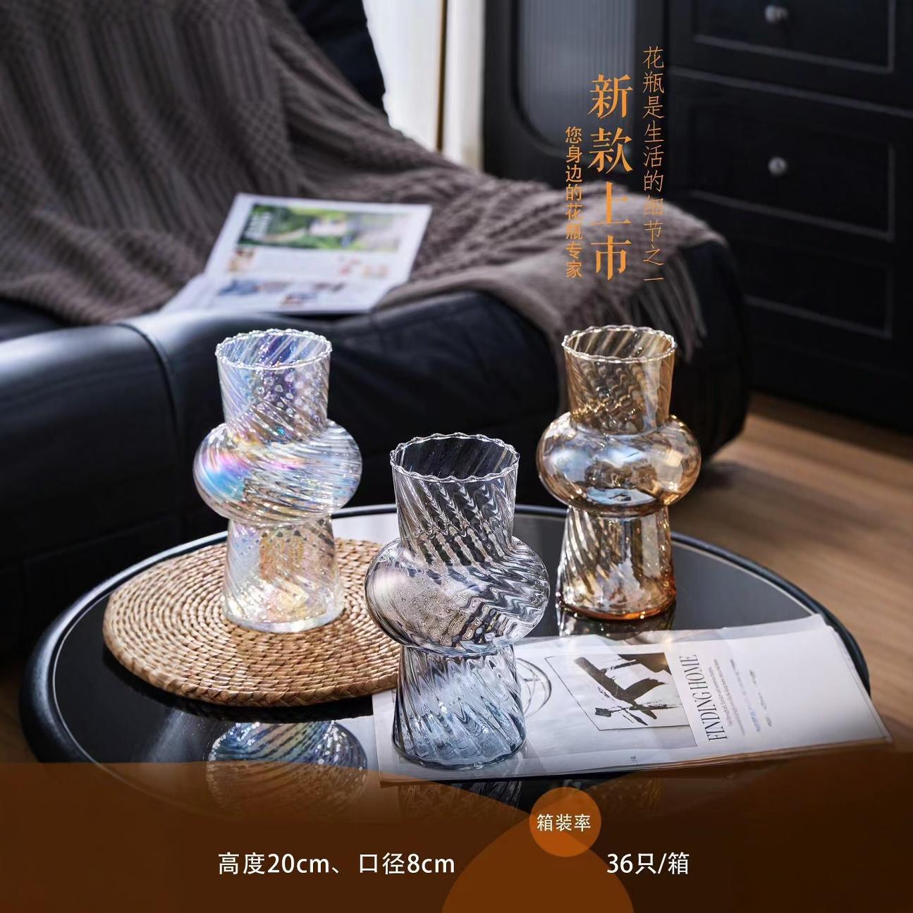 新款简约纽纹玻璃花瓶家用摆件水培Vase插花器彩色灯笼花瓶厂家批