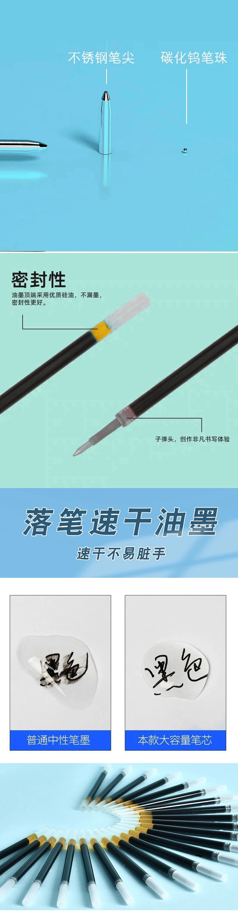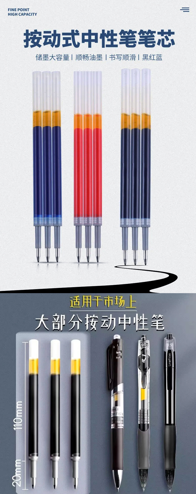 材质: 塑料 货号: 按动笔芯 品牌: 其他 用途: 书写 签字 贸易属性: 内贸 包装方式: 散装 型号: 按动笔芯 线幅: 0.5mm 是否进口: 否 颜色: 黑色,红色,蓝色 是否跨境出口专供货源: 否 重量: 0.01 kg/支