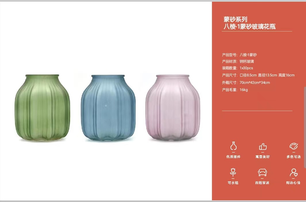 货号: 八棱系列 品牌: 其他 材质: 玻璃 加工定制: 否 表面工艺: 彩绘,喷绘,电镀,镀彩,描金,上釉,其他 包装: 普通包装 风格: 欧式 工艺: 彩绘,电镀,贴花,色釉,其他 是否专利货源: 否 尺寸: 八棱-1蒙砂玻璃花瓶,八棱2蒙砂玻璃花瓶