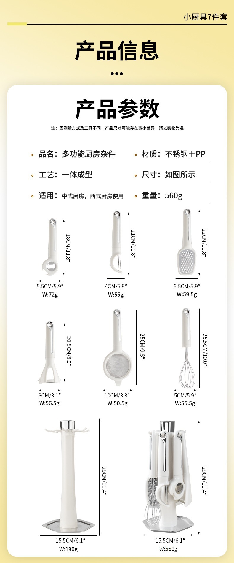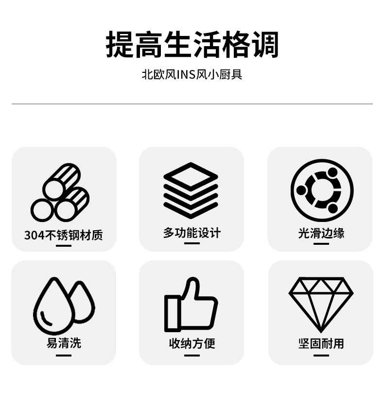 品牌: 是 是否进口: 否 产品类别: 厨房小工具套装 货号: K-B08 产地: 阳江 适用送礼场合: 其他 加印LOGO: 可以 加工定制: 是 产品上市时间: 2025 价格段: 30-40元 是否有专利: 无 是否跨境出口专供货源: 是 风格: 现代简约 材质: 不锈钢 重量: 0.5 kg/套