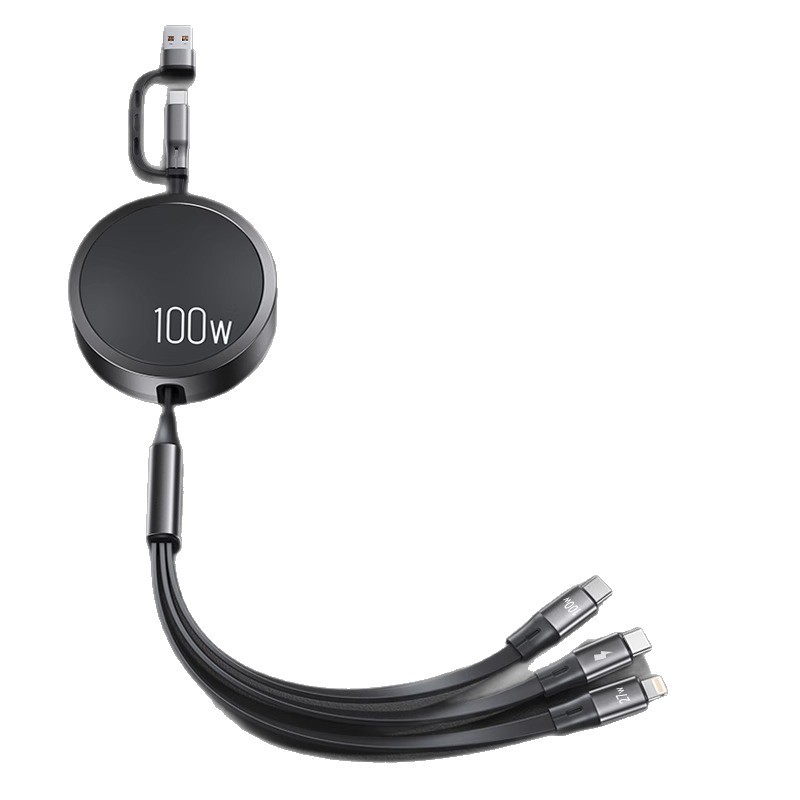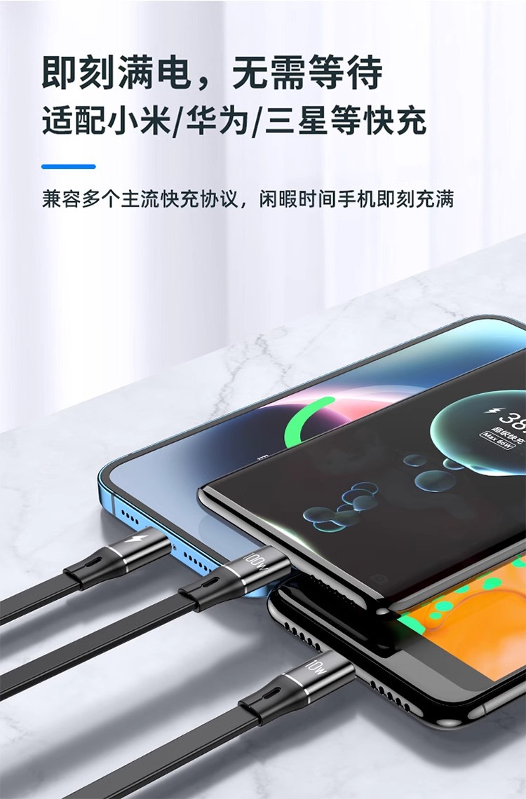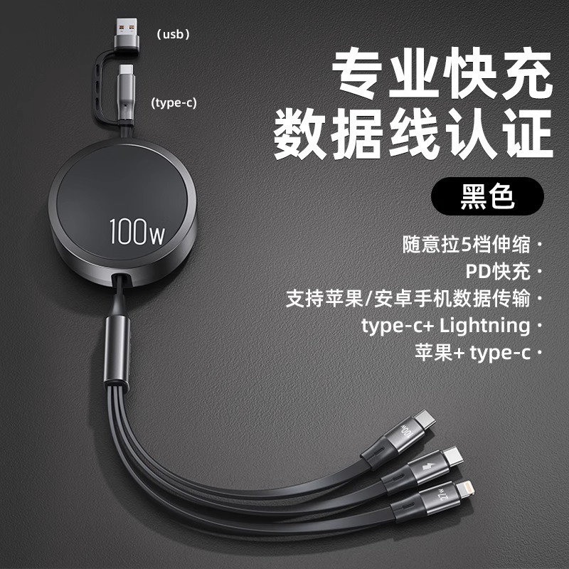 三合一数据线100W快充一拖三Typec手机车载充电线头宝伸缩多功能