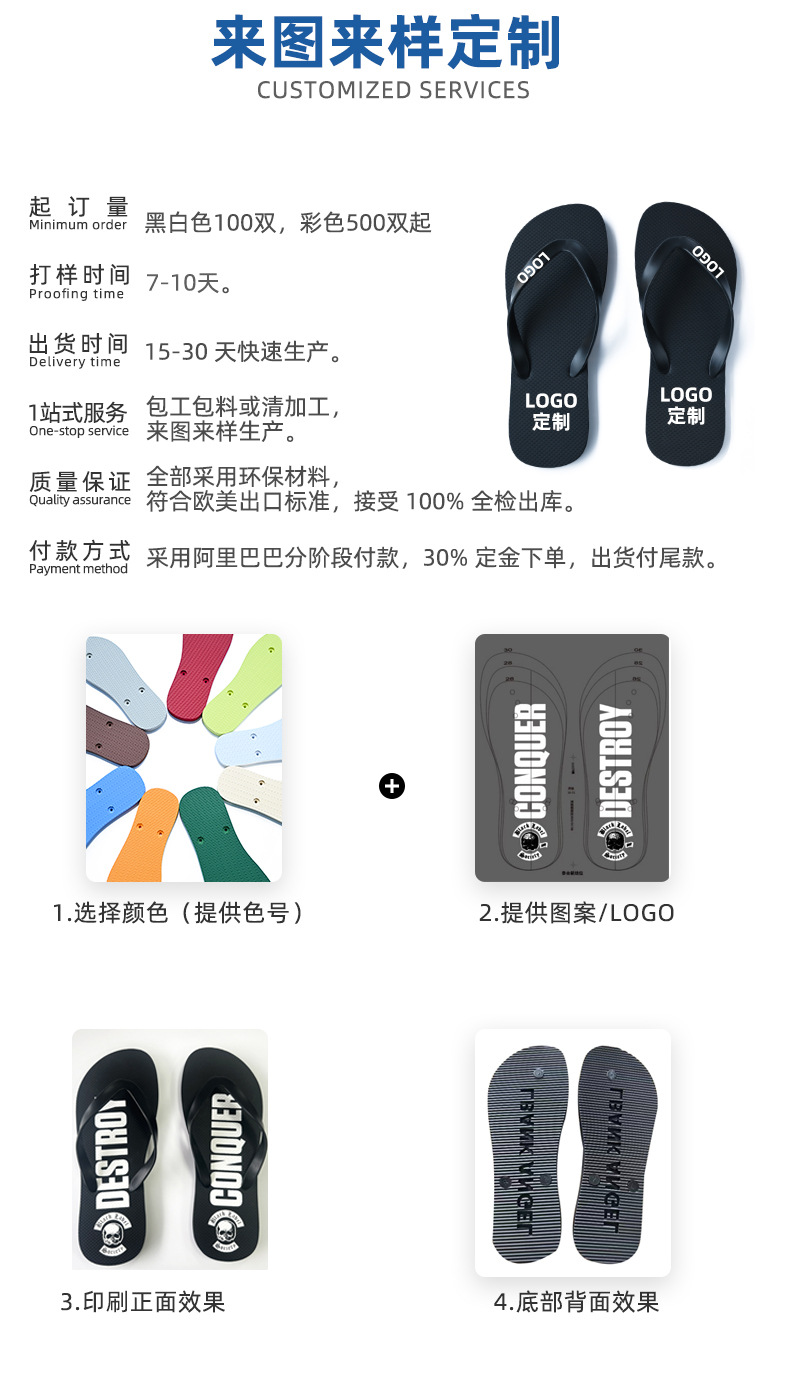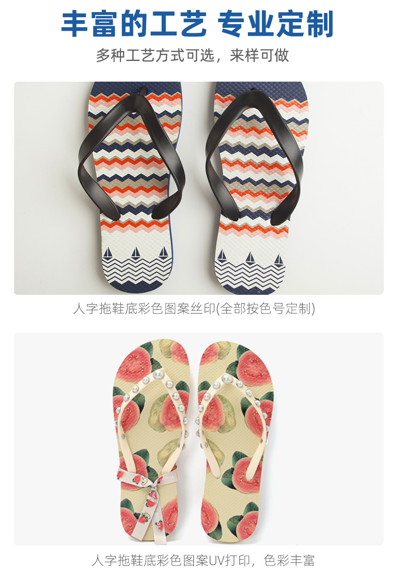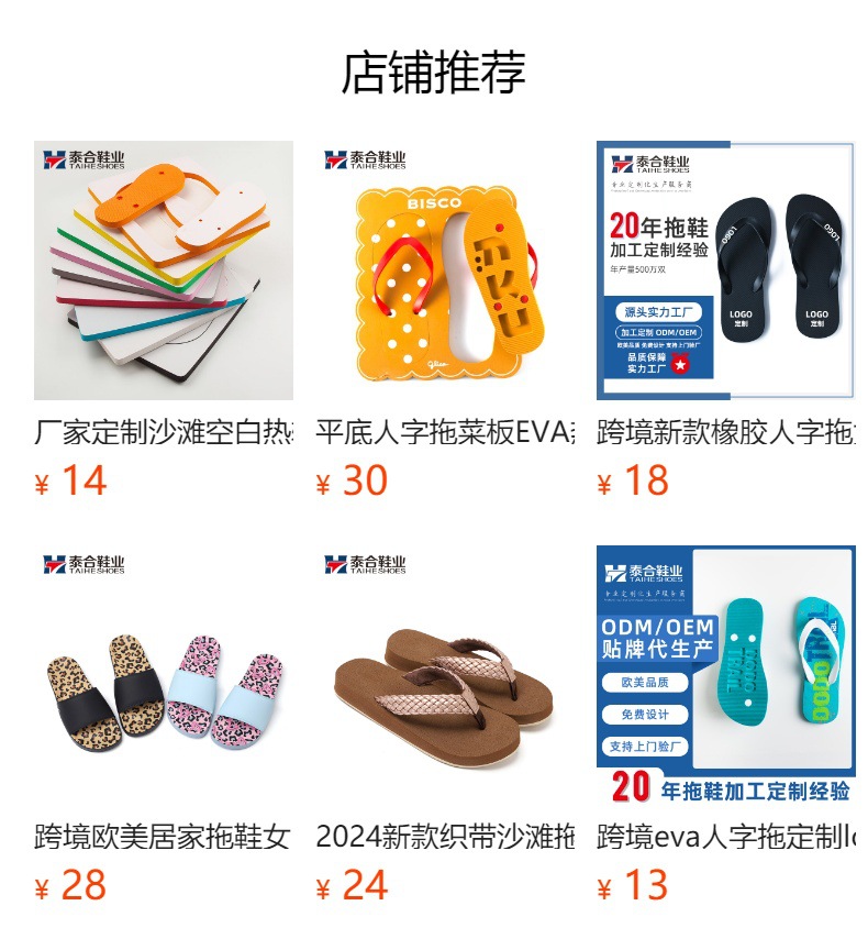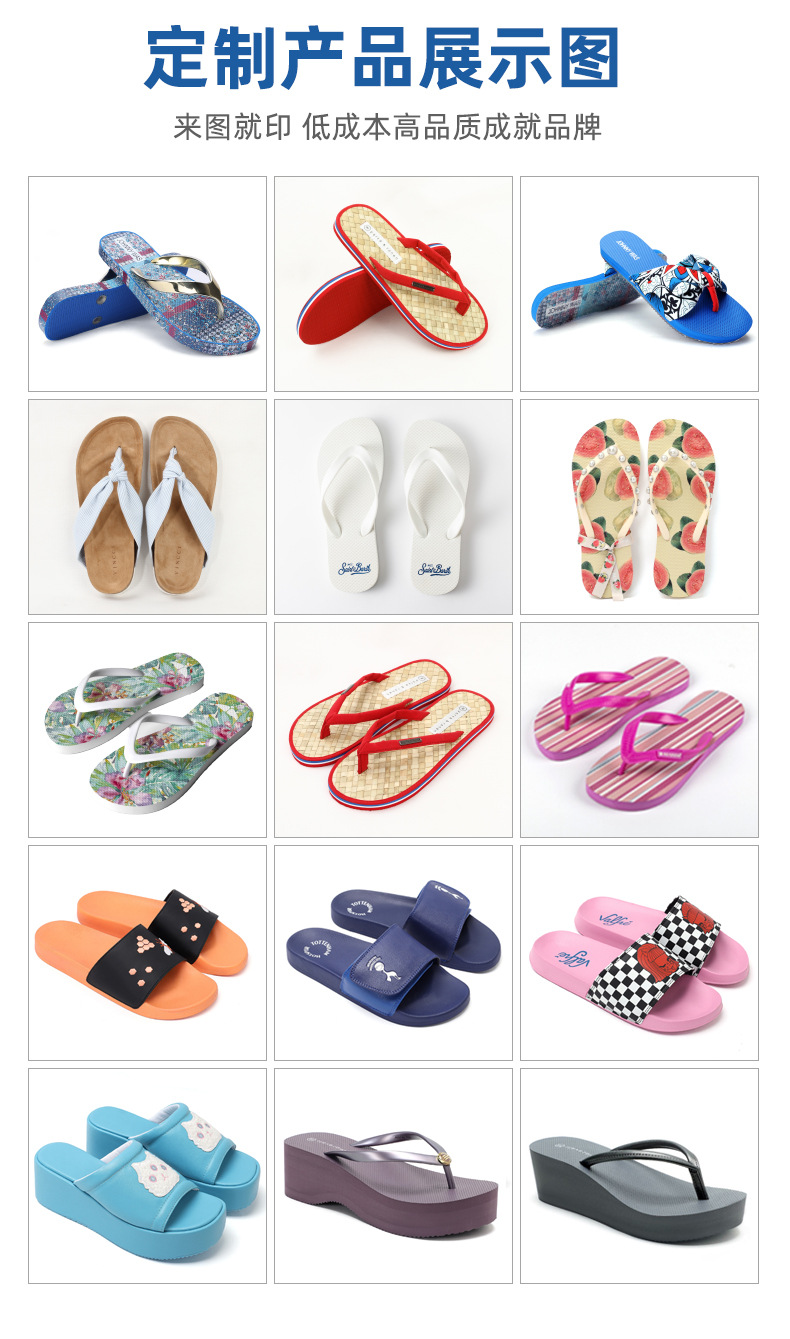 因为定制产品款式众多,具体报价请咨询客服旺旺或电话联系我们!我们一定给您生产具有高品质性价比的人字拖鞋。订货找我,人字拖定制请找准泰合鞋业,厂家直销价格更低!选择EVA、橡胶、PVC等环保材质,专注鞋材发泡技术,产品主要出口欧美、中东、东南亚等国家,均可通过环保检测。