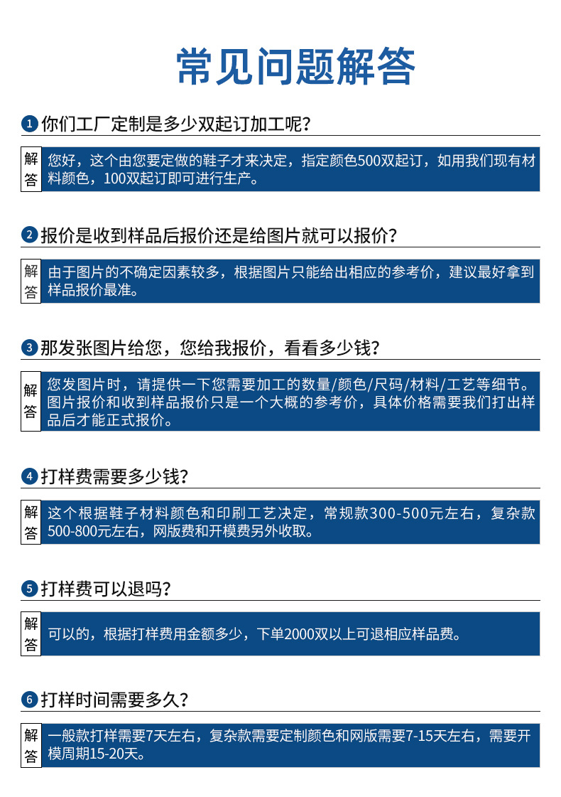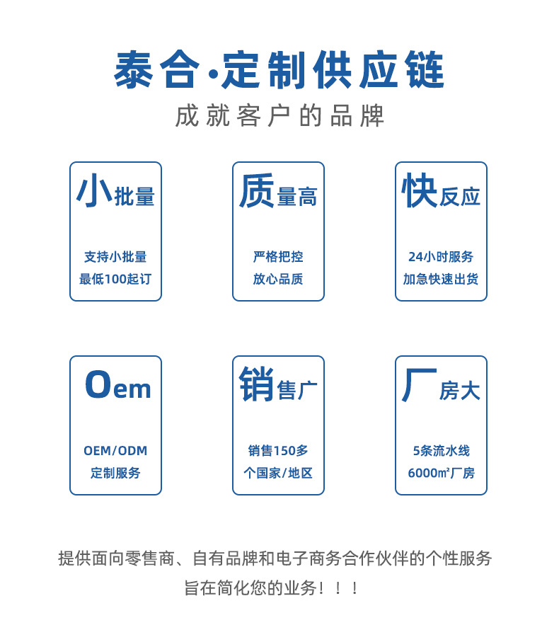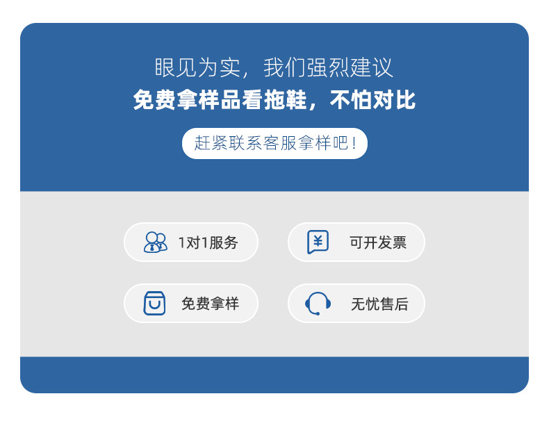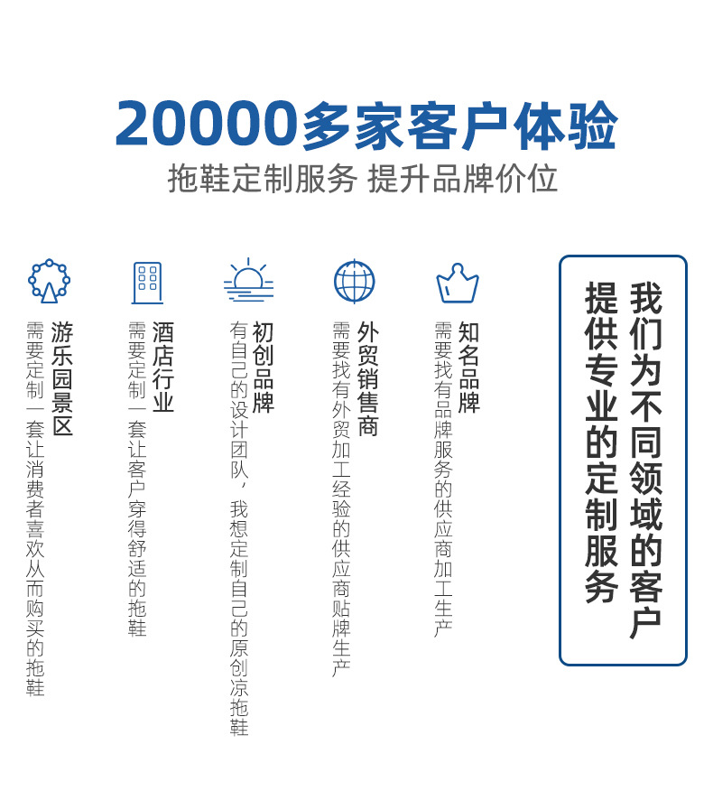 因为定制产品款式众多,具体报价请咨询客服旺旺或电话联系我们!我们一定给您生产具有高品质性价比的人字拖鞋。订货找我,人字拖定制请找准泰合鞋业,厂家直销价格更低!选择EVA、橡胶、PVC等环保材质,专注鞋材发泡技术,产品主要出口欧美、中东、东南亚等国家,均可通过环保检测。