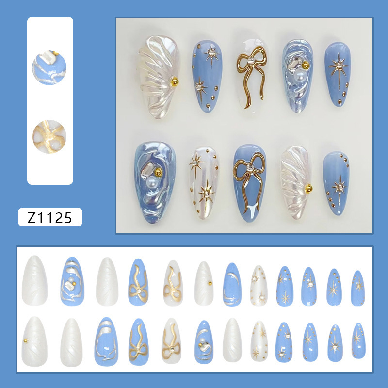 穿戴甲美甲立体海洋蓝鎏金闪钻蝴蝶结假指甲贴片可拆卸甲片24批发 English | 投诉