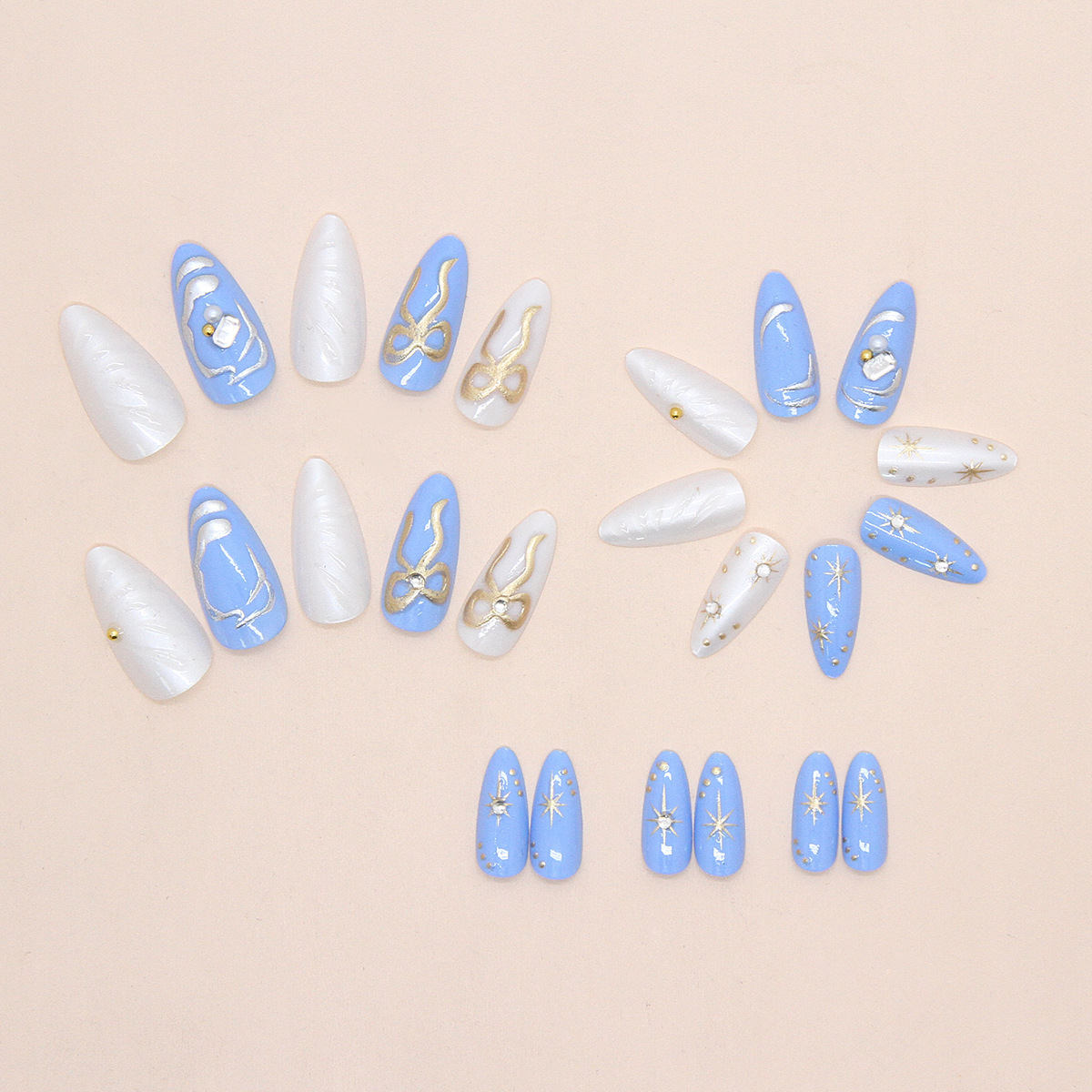穿戴甲美甲立体海洋蓝鎏金闪钻蝴蝶结假指甲贴片可拆卸甲片24批发