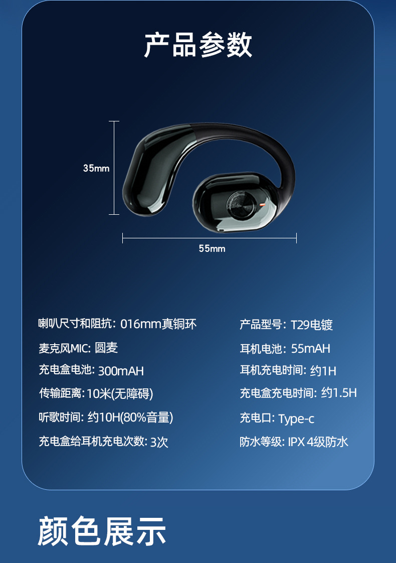 新款私模OWS蓝牙耳机超长续航T29挂耳式无线运动智能电镀耳机
