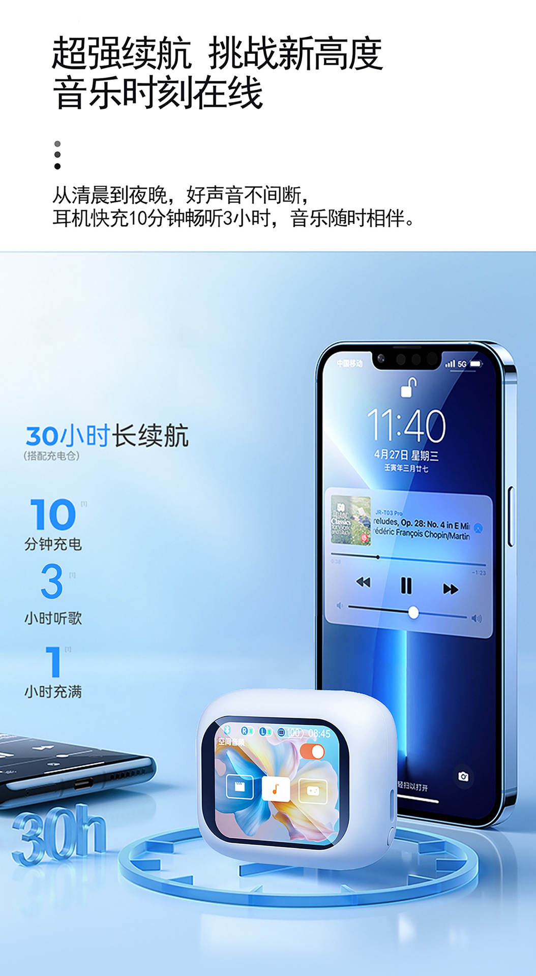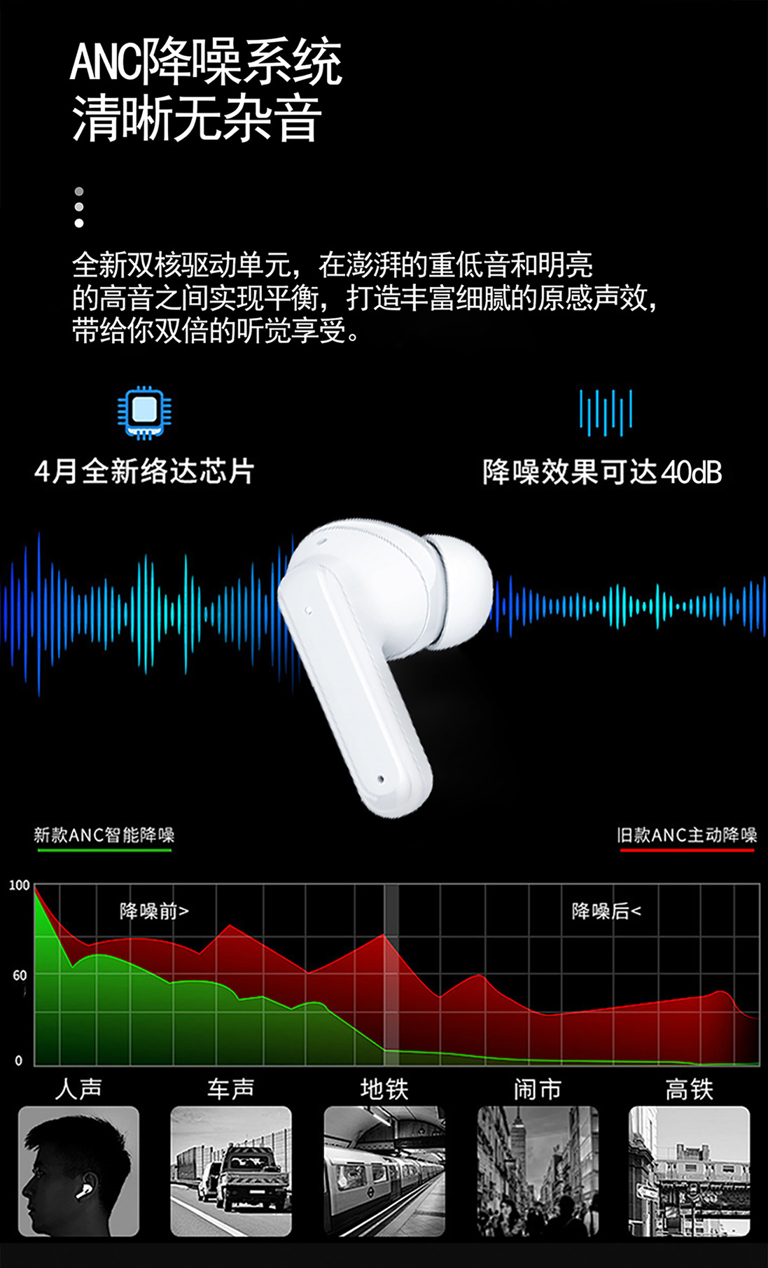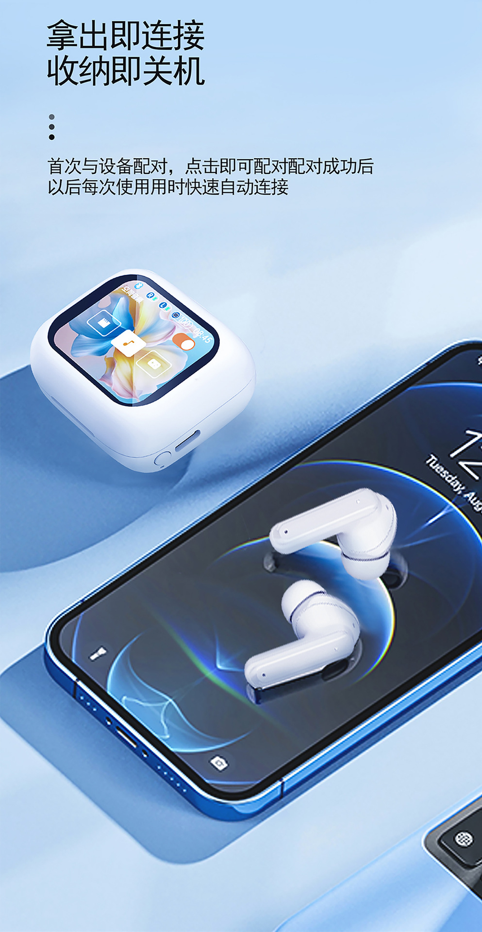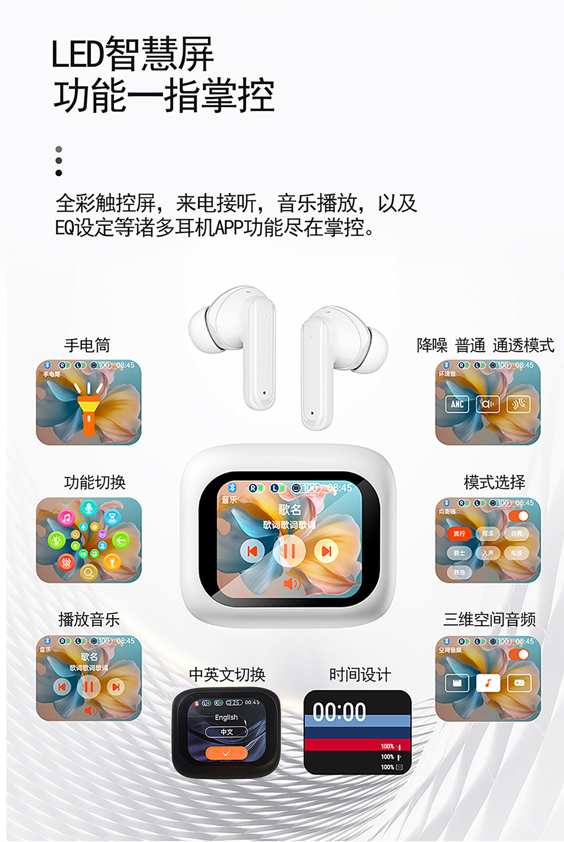 爆款T9智慧彩屏蓝牙耳机ANC+ENC降噪入耳式超长续航触控无线耳机