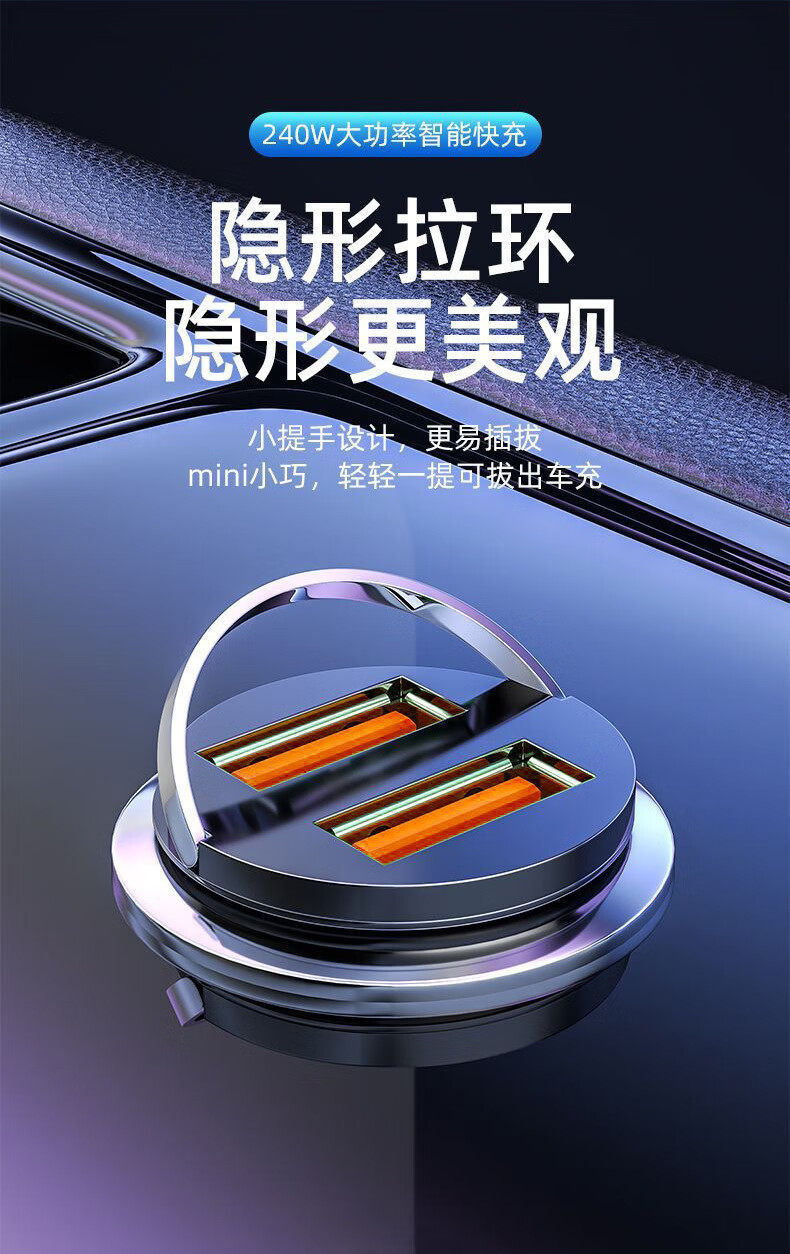新款240W车载充电器超级快充隐形12V24V点烟器一拖二USB转换插头