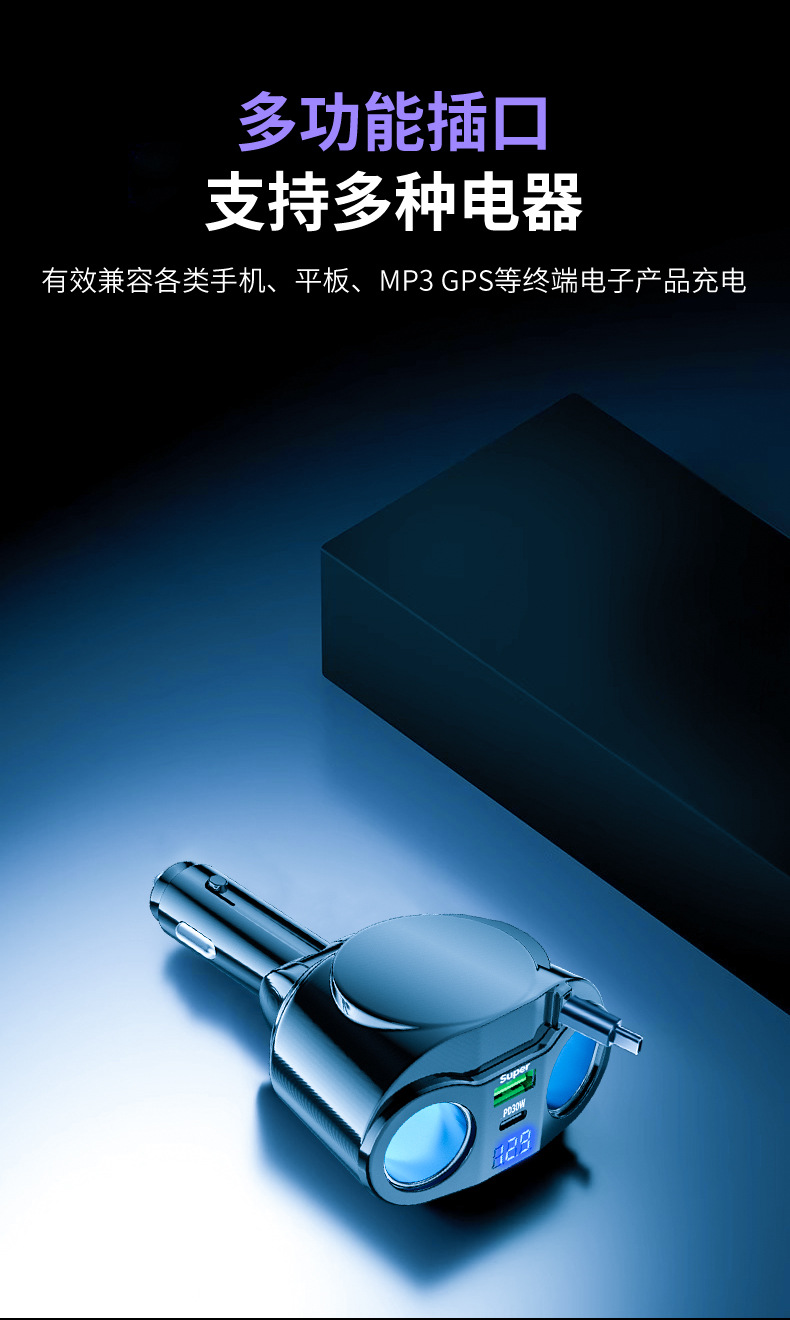品牌: XAYVG/小优格 加工定制: 是 输出电流: 5000mA 输出接口: TYPE-C 货号: F86 有可授权的自有品牌: 是 是否跨境出口专供货源: 是 充电类型: 快速充电 充电方式: 有线充电 电源方式: 点烟器电源 是否数显: 是 最大输出功率: 120w 是否专利货源: 否 输出功率: 120w 重量: 0.125 kg/套