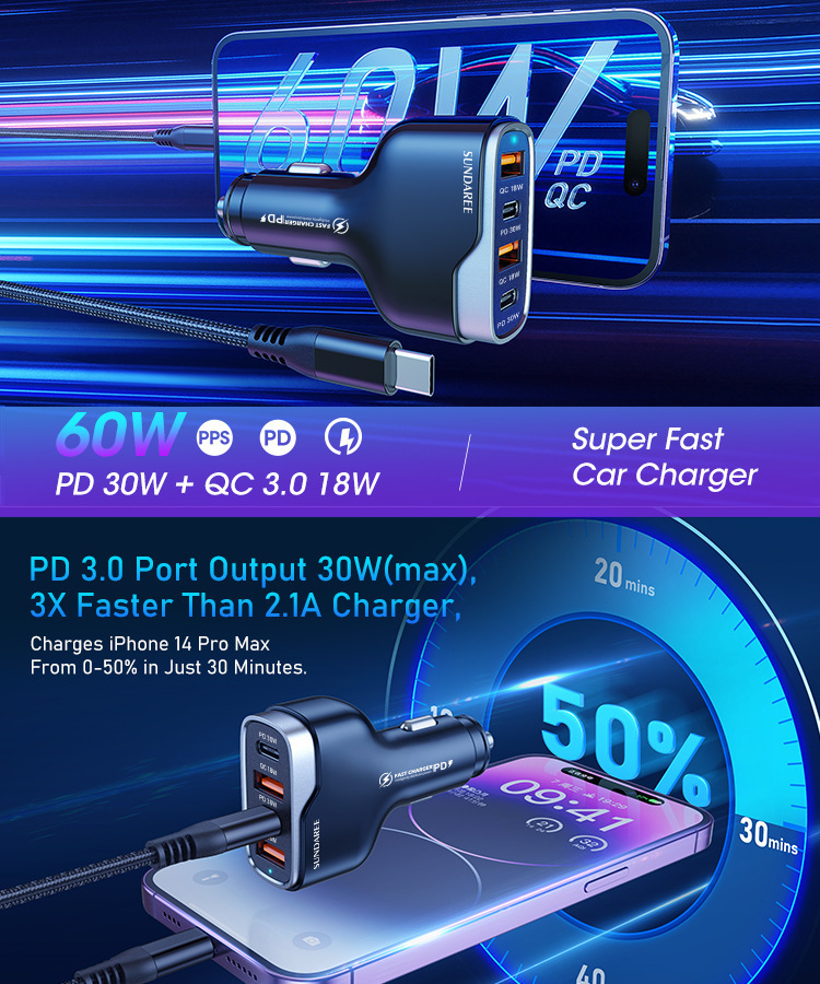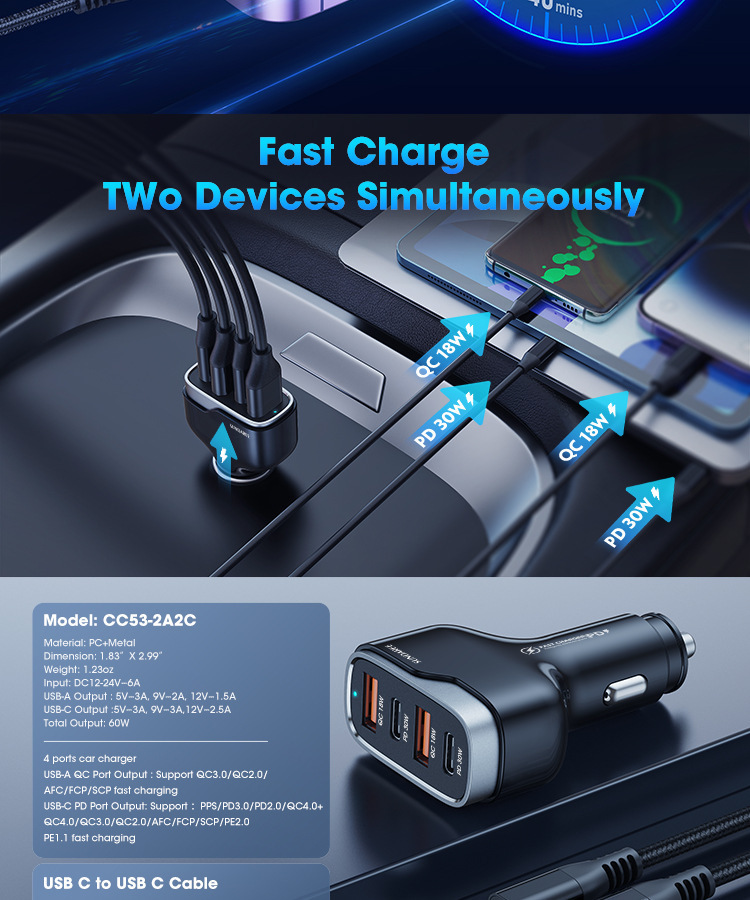 亚马逊60W车充快充双PD30W+双QC3.018W车载充电器USB车充厂家批发