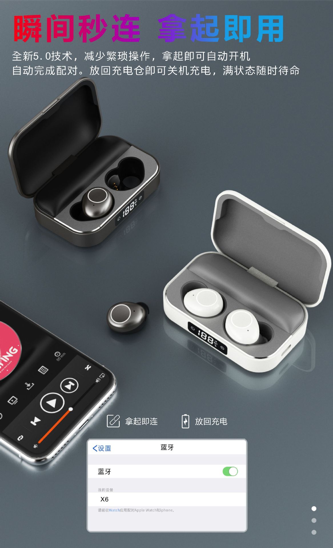 品牌: XAYVG 传输范围: 10米 蓝牙协议: 5.0 使用方式: 耳塞式 是否单双耳: 双边立体声 颜色: 铁灰色 有可授权的自有品牌: 是 是否跨境出口专供货源: 是 支持订制: 支持 是否专利货源: 否 模具类型: 私模 芯片类型: 络达 续航时间: 8小时以上 上市年份/季节: 2020/5 风格: 创意设计 防水性能: IPX6 货号: X6 材质: 铝合金 重量: 0.274 kg/套