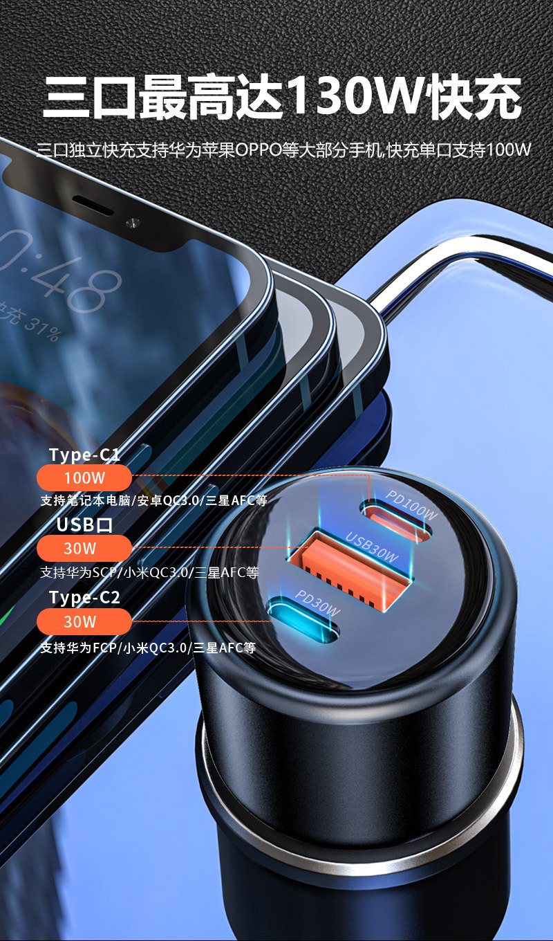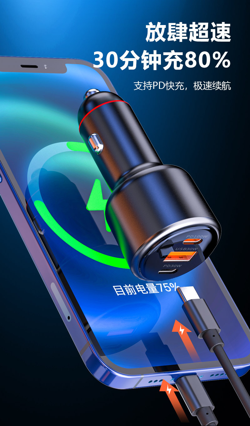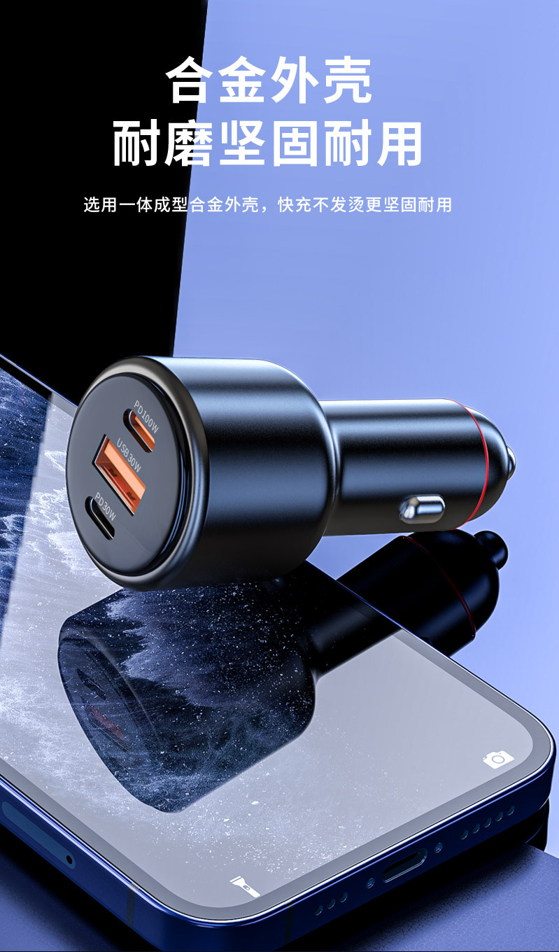 新款车载充电器pd100w超级快充汽车用多功能点烟器一拖二转换插头