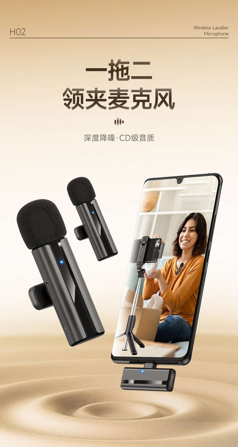 新款H02领夹麦克风一拖二户外直播收音麦无线降噪拍摄录音K歌电脑
