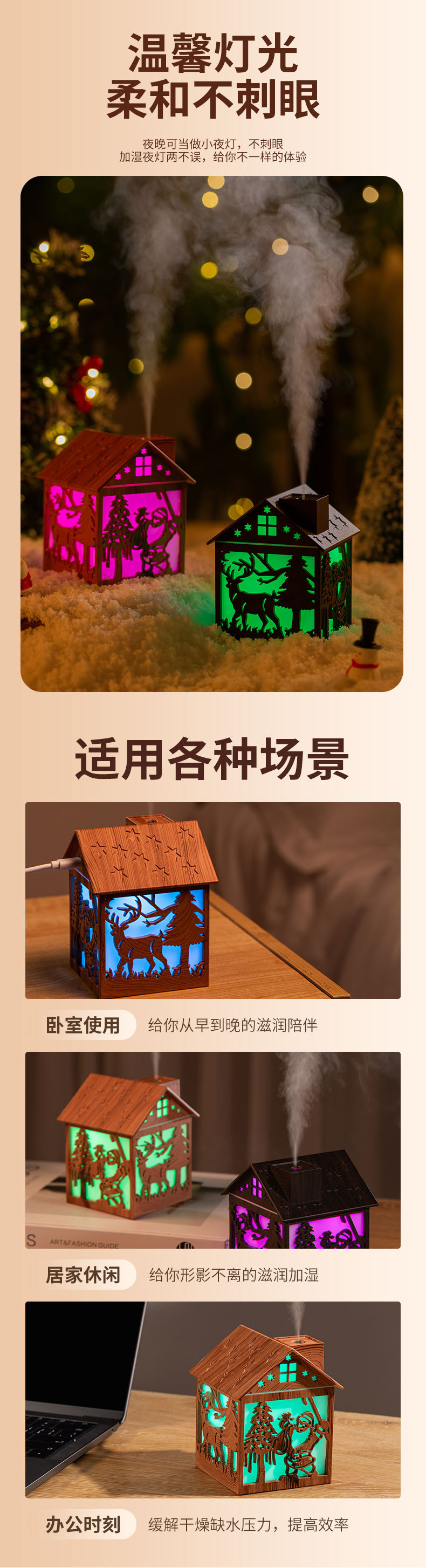 木屋加湿器USB充电大雾量桌面氛围七彩变色夜灯两档喷雾静音加湿 投诉