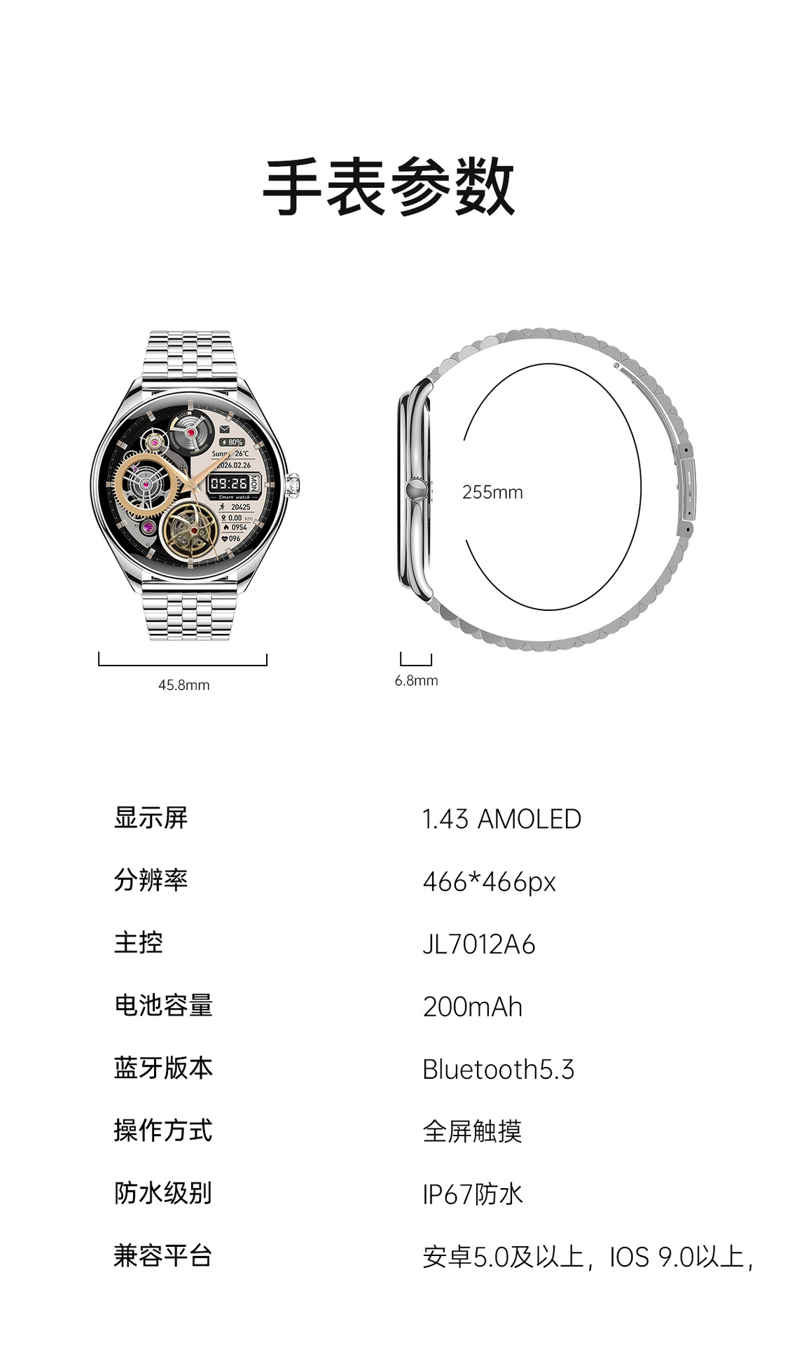 MT55智能手表超薄6.8mm心率血氧监测1.43AMoled防水语音蓝牙通话