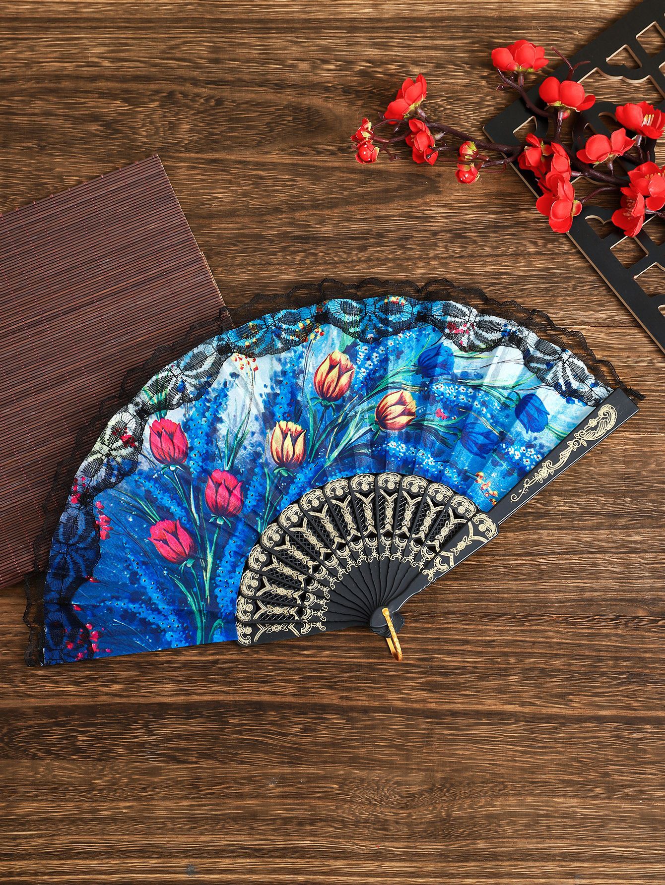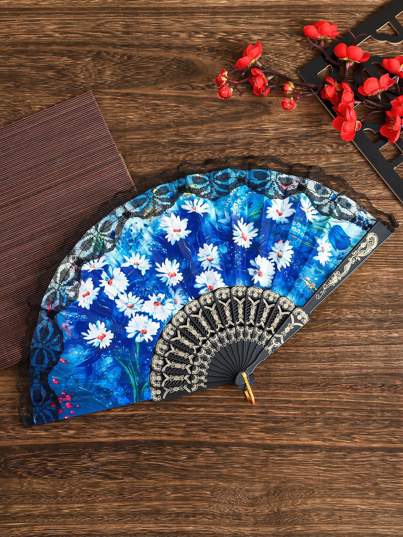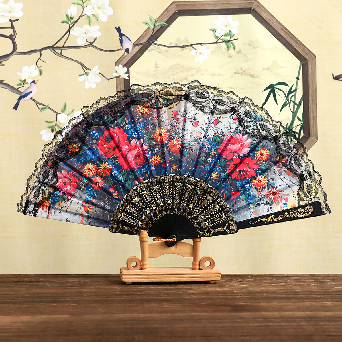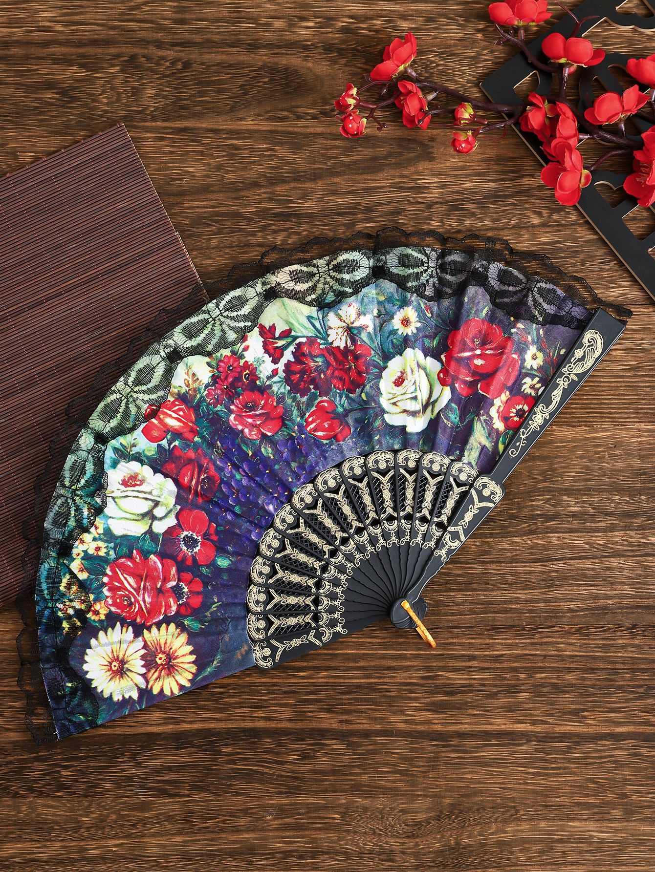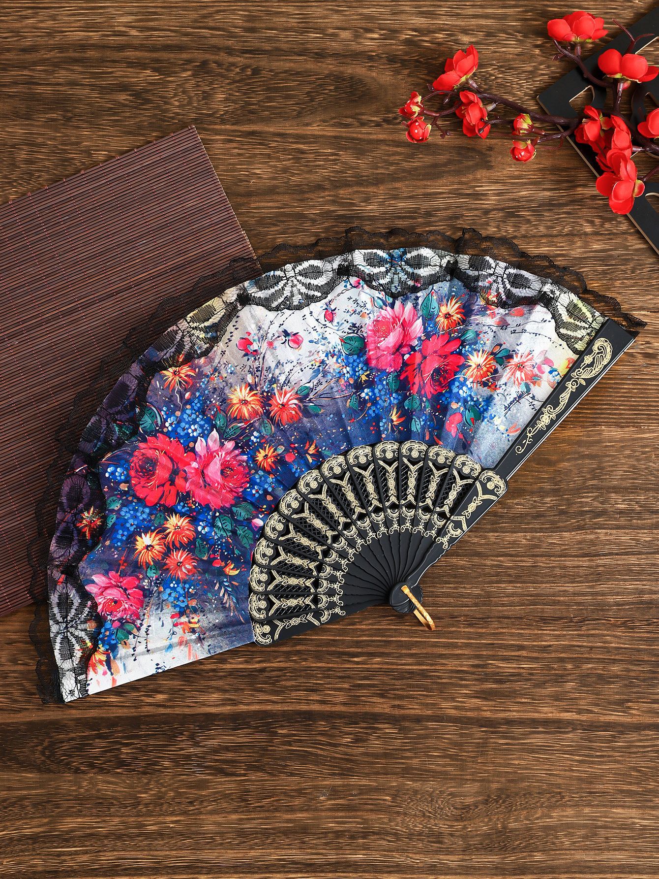 花卉黑杆蕾丝花边扇塑料女扇西班牙折扇精美绢布礼品扇舞蹈道