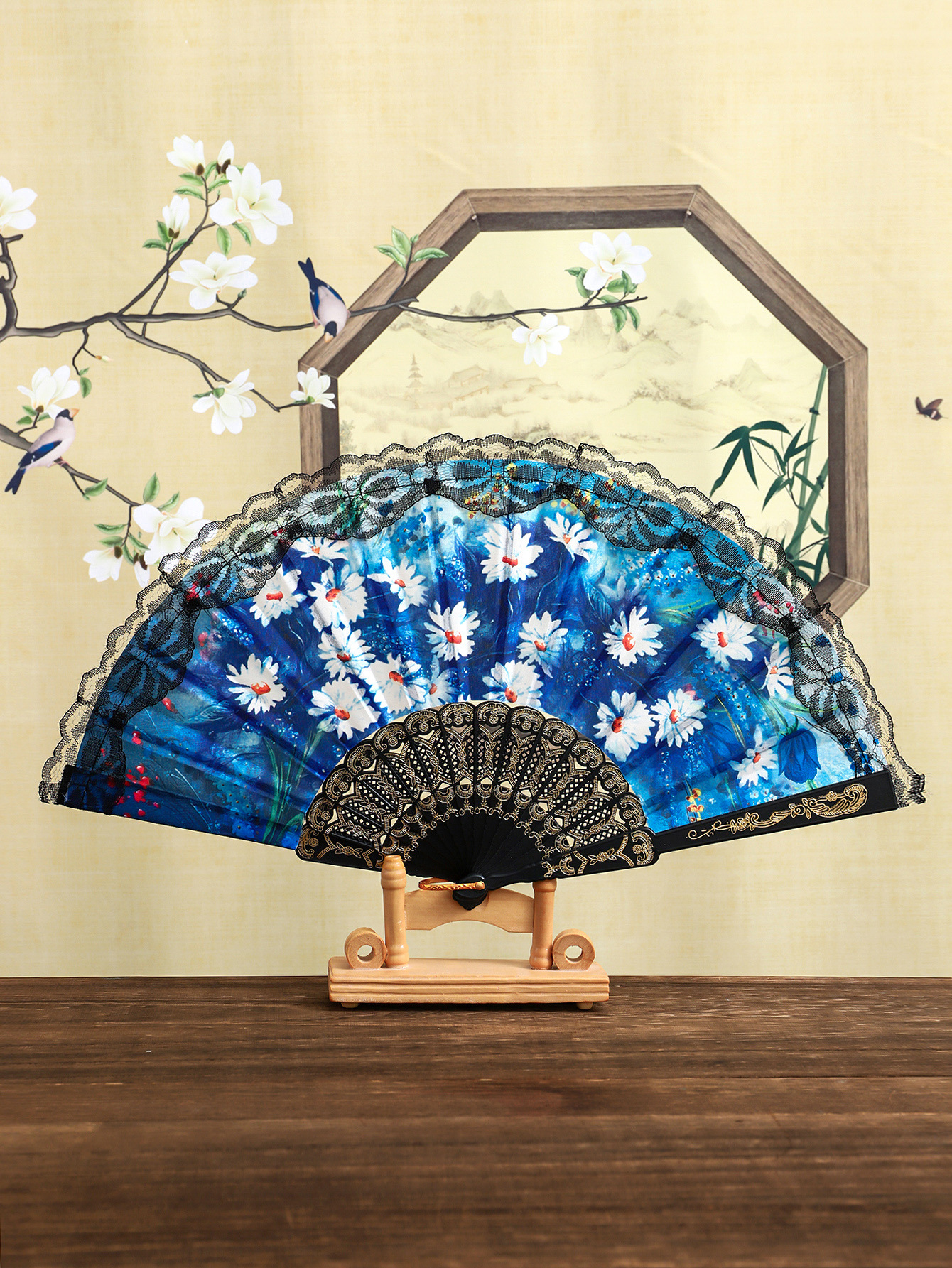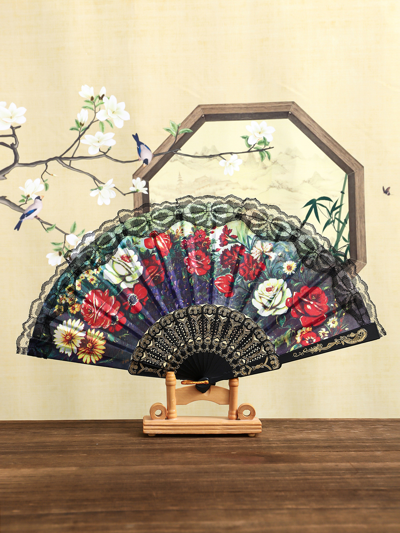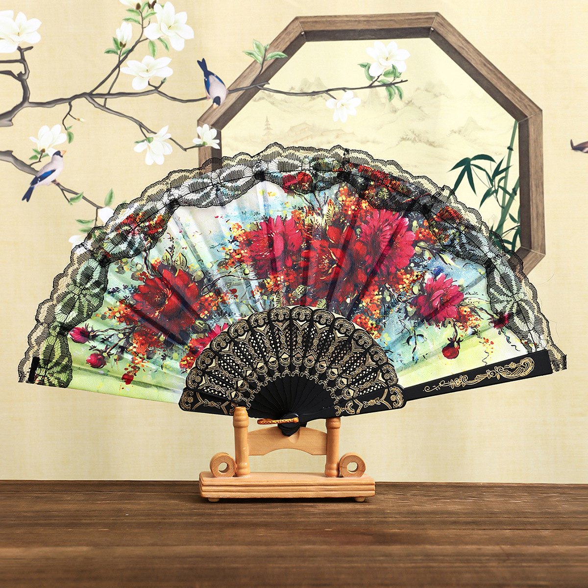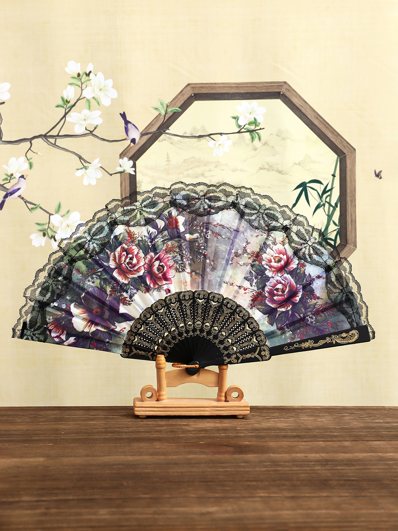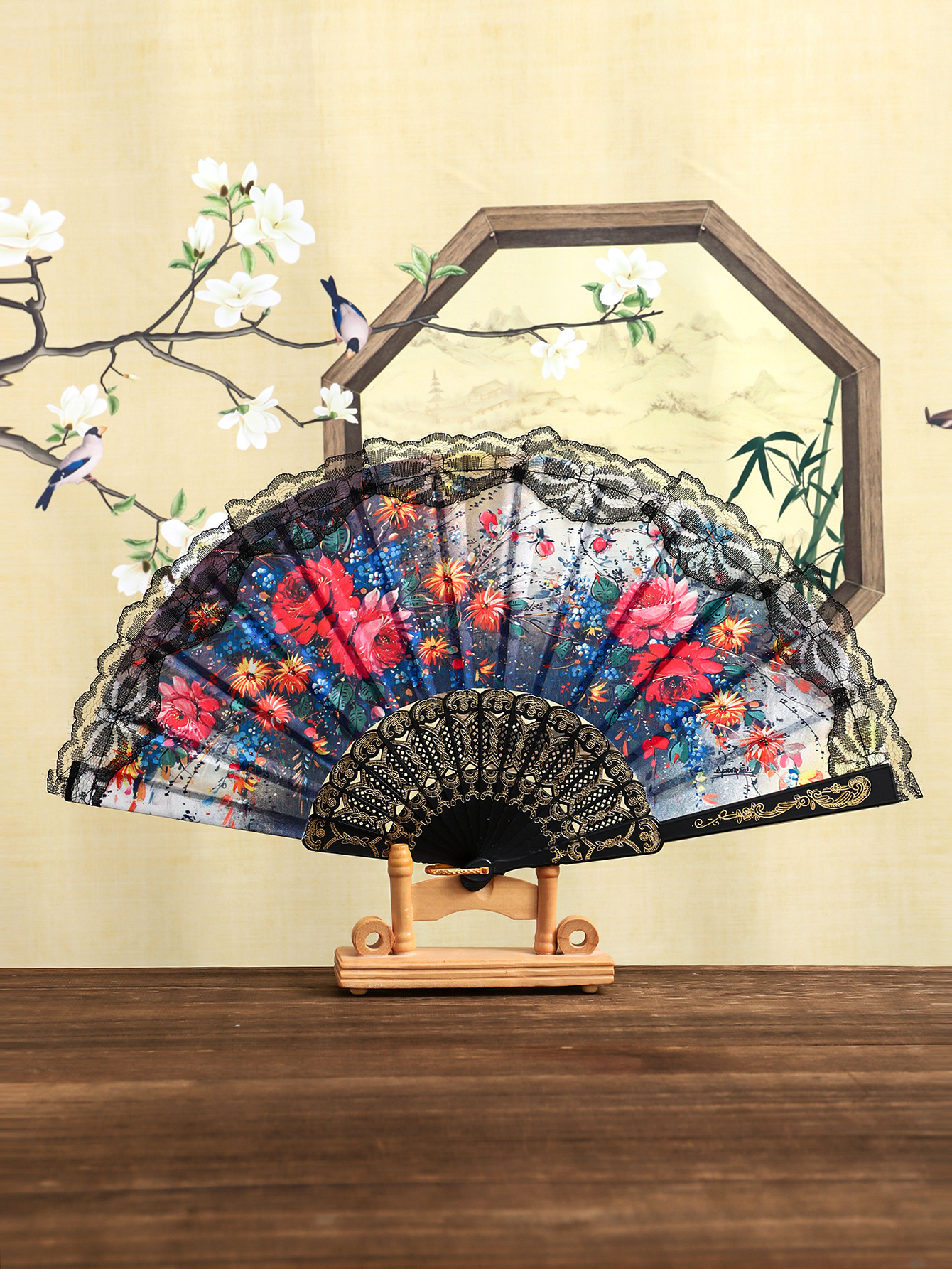 花卉黑杆蕾丝花边扇塑料女扇西班牙折扇精美绢布礼品扇舞蹈道