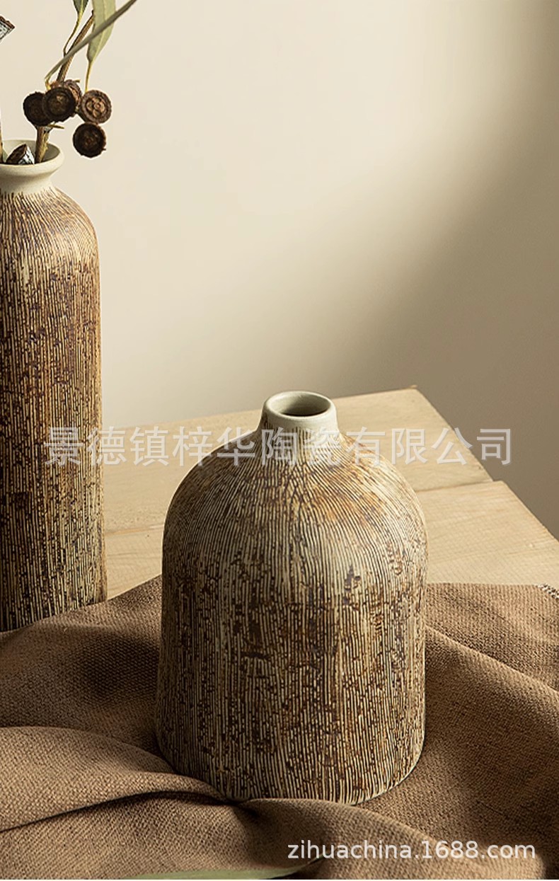 景德镇日式禅意家居装饰品复古文艺刻纹手工陶瓷水培花瓶酒店摆件