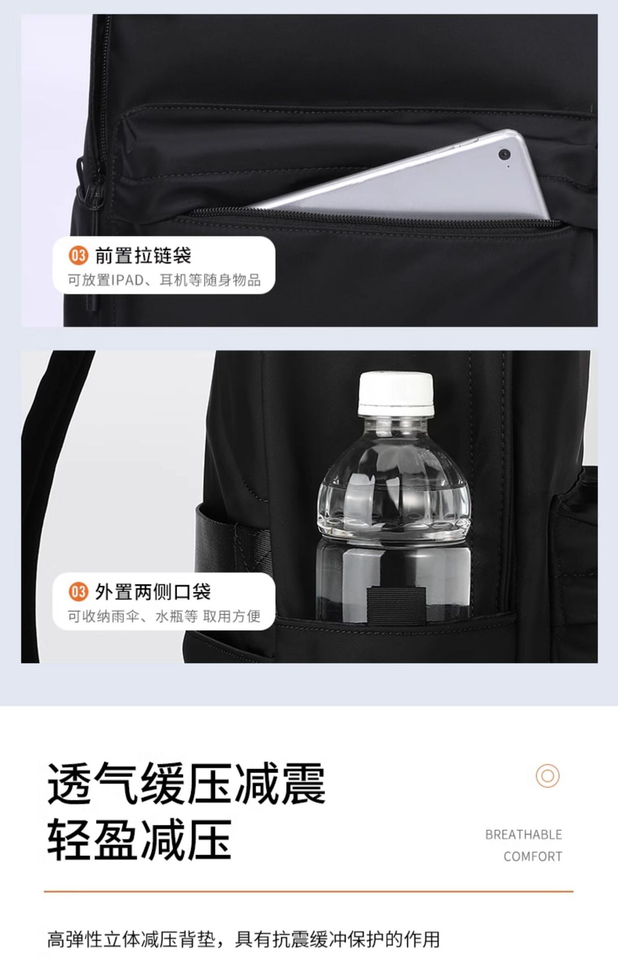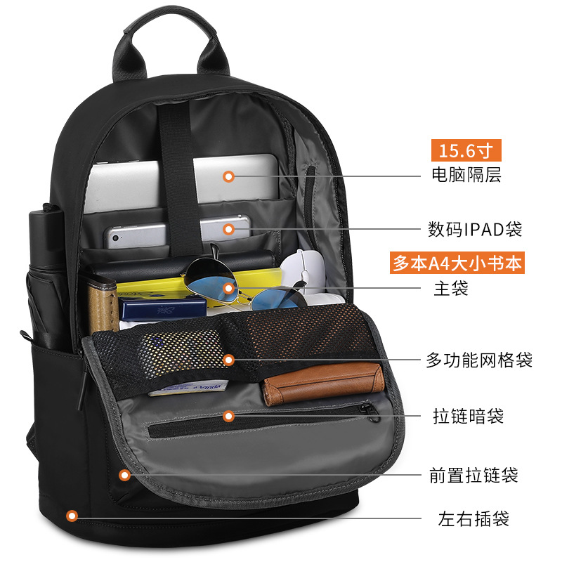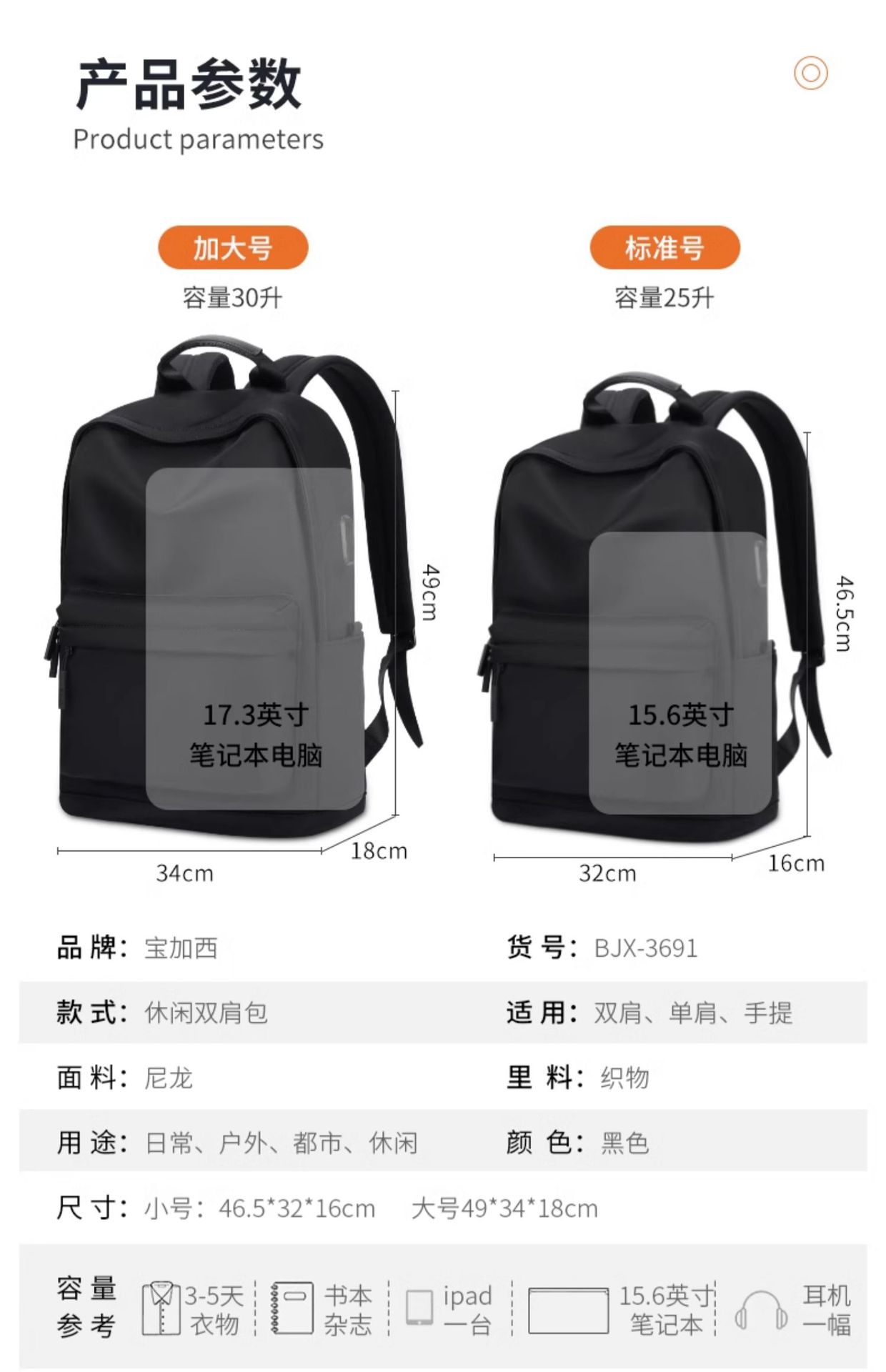 颜色: 黑色小号,黑色大号 适用性别: 中性/男女均可 适用场景: 休闲旅行 材质: 尼龙布 风格: 都市简约 品牌: BJIAX/宝加西 皮质特征: 软 容量: 20-35L 功能: 防水 容纳电脑尺寸: 15英寸 上市年份季节: 2024年春季 货号: BJX-3691 图案: 纯色 里料质地: 涤纶 流行元素: 车缝线 背负系统: 气垫背带 有可授权的自有品牌: 是 重量: 0.5 kg/计