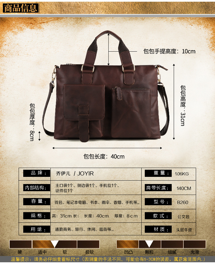 风格: 商务通勤 货号: B260 材质: 真皮 皮质特征: 头层牛皮 品牌: DUJIANG/独匠 图案: 纯色 流行元素: 车缝线 里料质地: 涤棉 有可授权的自有品牌: 是 上市年份季节: 2023年春季 适用场景: 商务出行 容纳电脑尺寸: 13英寸 功能: 耐磨 商家编码: b260 重量: 0.5 kg/个
