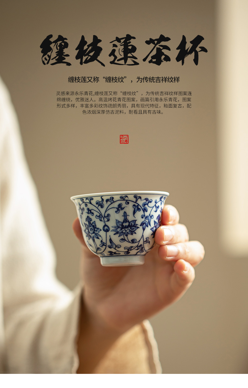 景德镇手工压手杯青花主人品茗杯功夫茶具客杯缠枝莲茶杯茶具陶瓷
