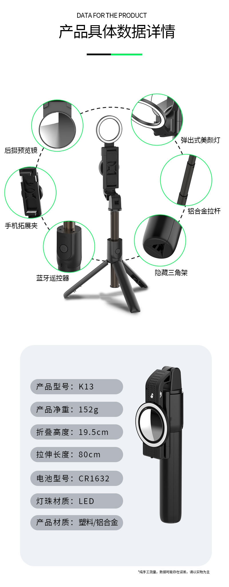新款K13蓝牙自拍杆 便携一体式三脚架通用手机直播支架带补光灯
