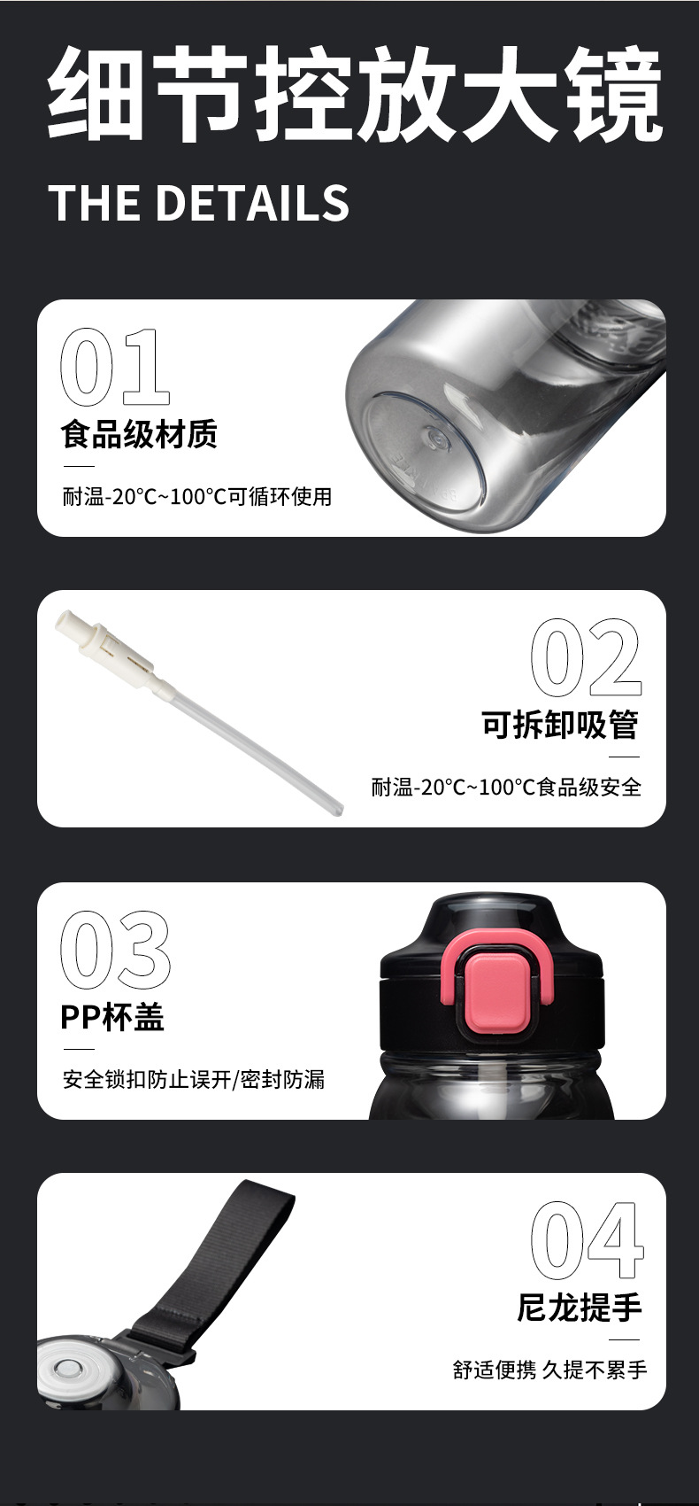 是否进口: 否 材质: tritan 是否有专利: 否 保温性能: 0-6小时 颜色: 月光白,绿色,粉红色,黑色 品牌: Rain Face 加印LOGO: 可以 加工定制: 是 价格段: 10-20元 产地: 永康 风格: 现代简约 样式: 有盖,带提绳,直身杯 有可授权的自有品牌: 是 产品质量等级: 优等品 是否跨境出口专供货源: 是 容量: 800ml 货号: XQ-211A 包装规格: 单个 产品类别: 塑料杯 版权: 无 重量: 0.5 kg/个