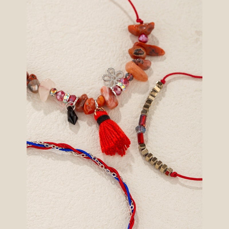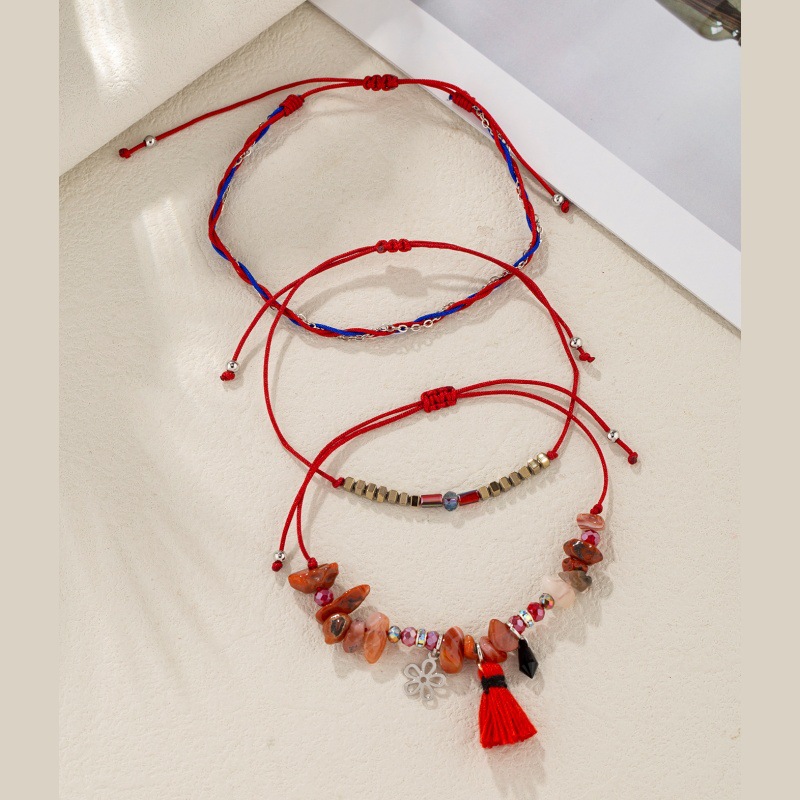新中式红色流苏花朵吊坠手绳饰品手工编织不规则天然石手链手串