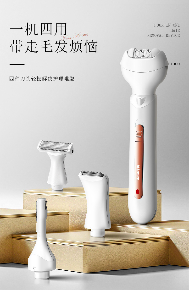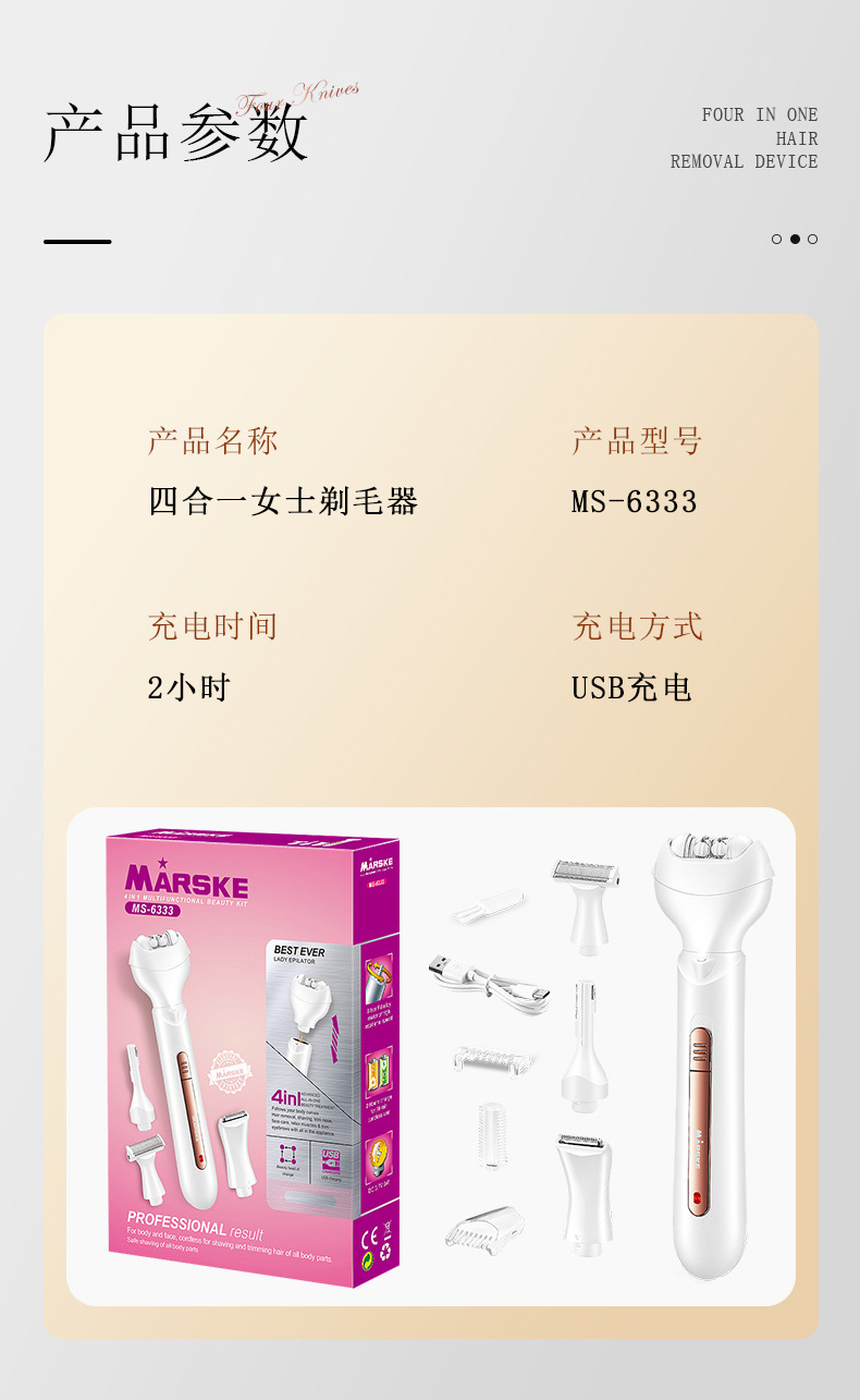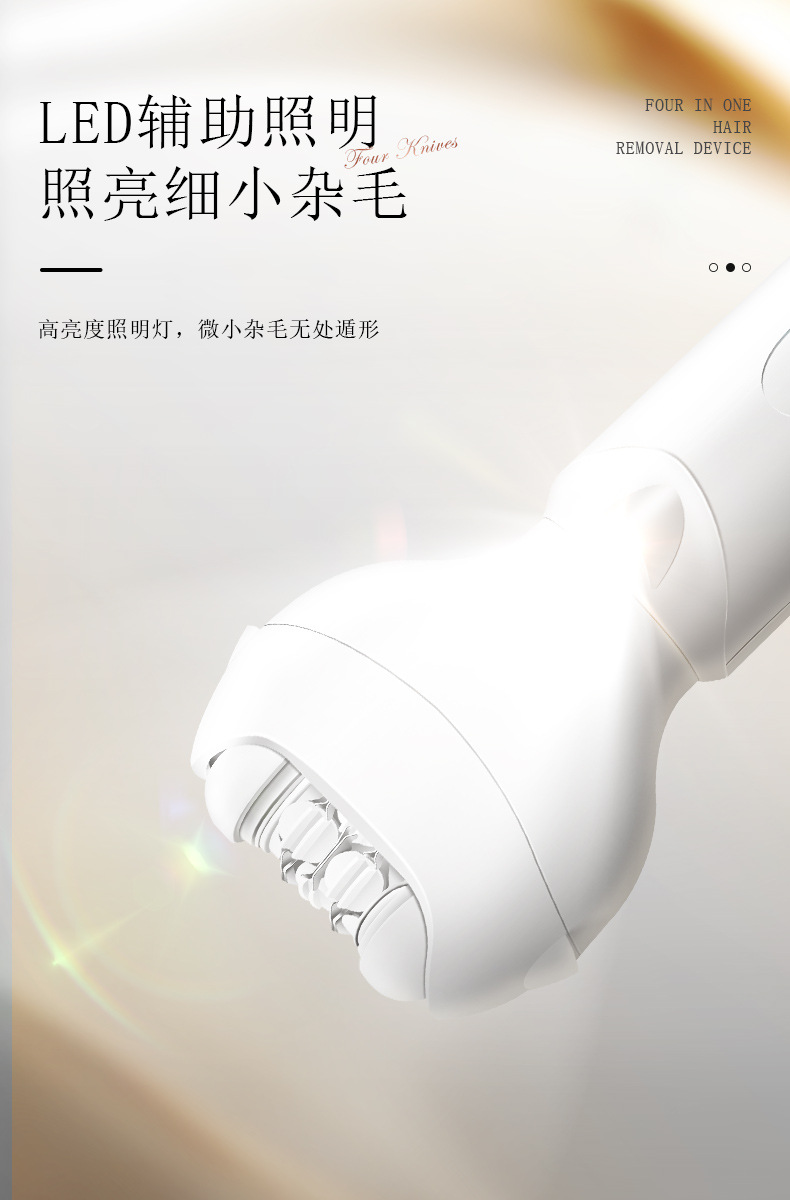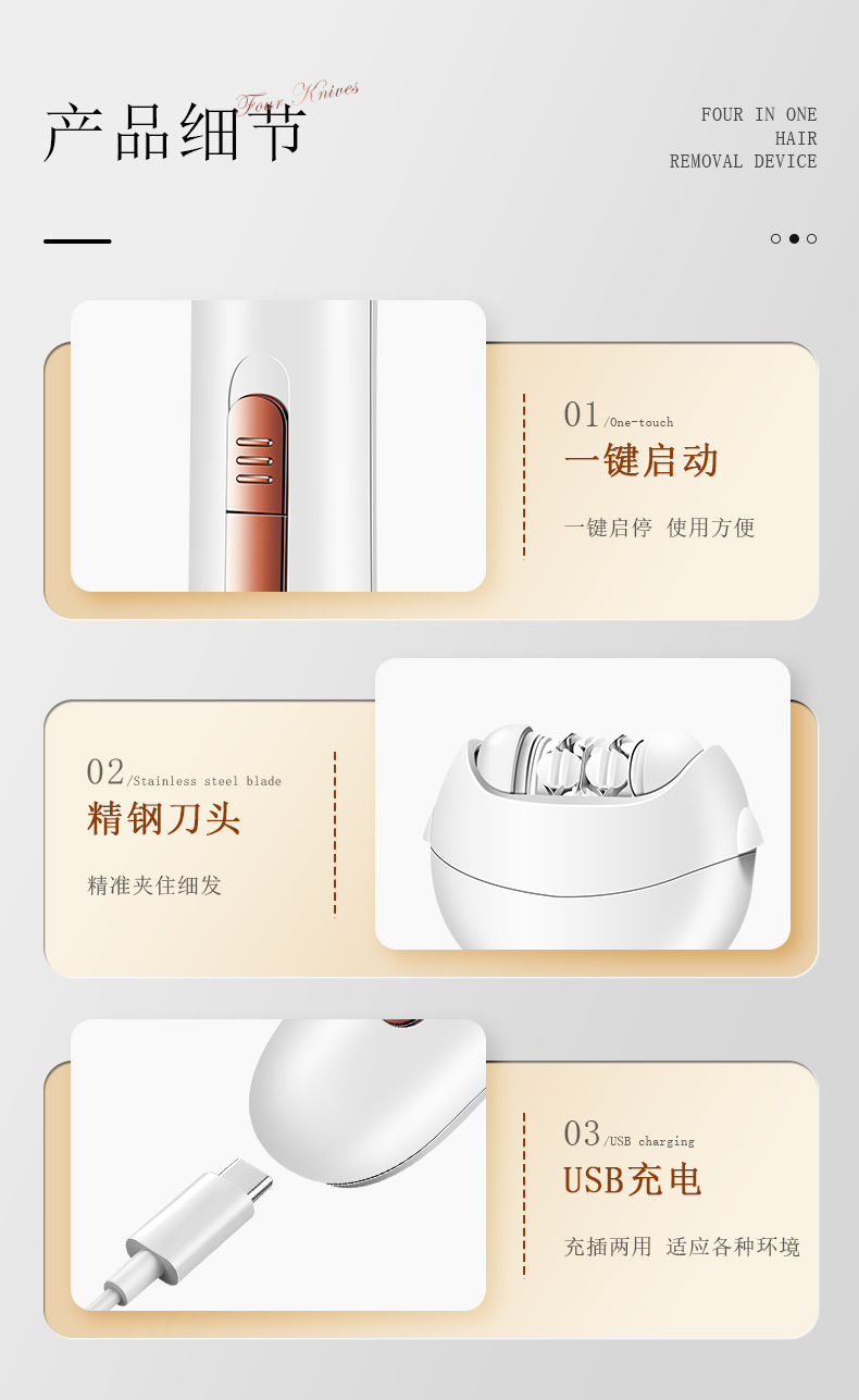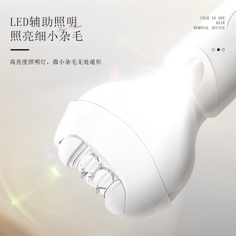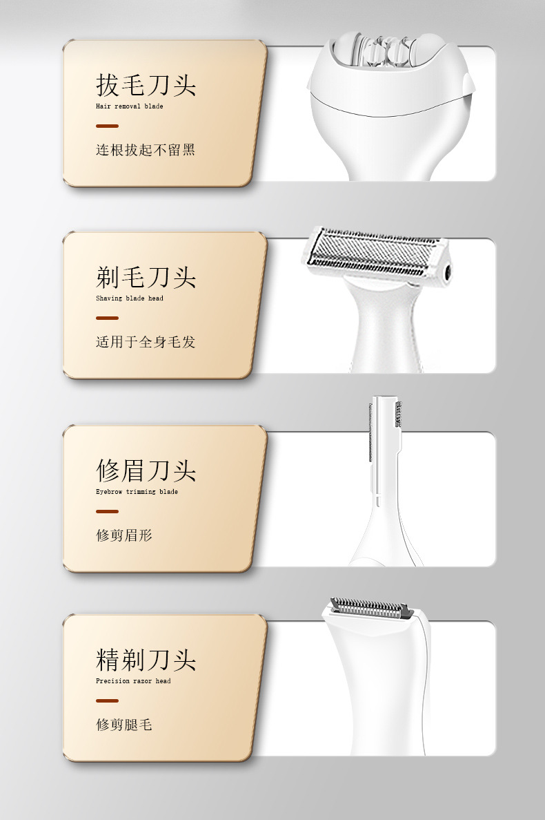 套装内含:脱毛器主机,剃毛刀头,T刀剃毛头,修眉头、鬓发刀头,,充电线, 英文说明书