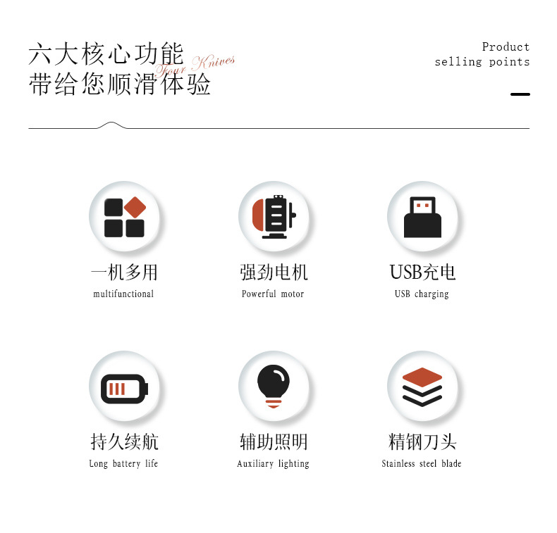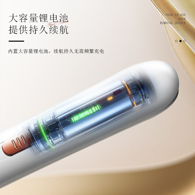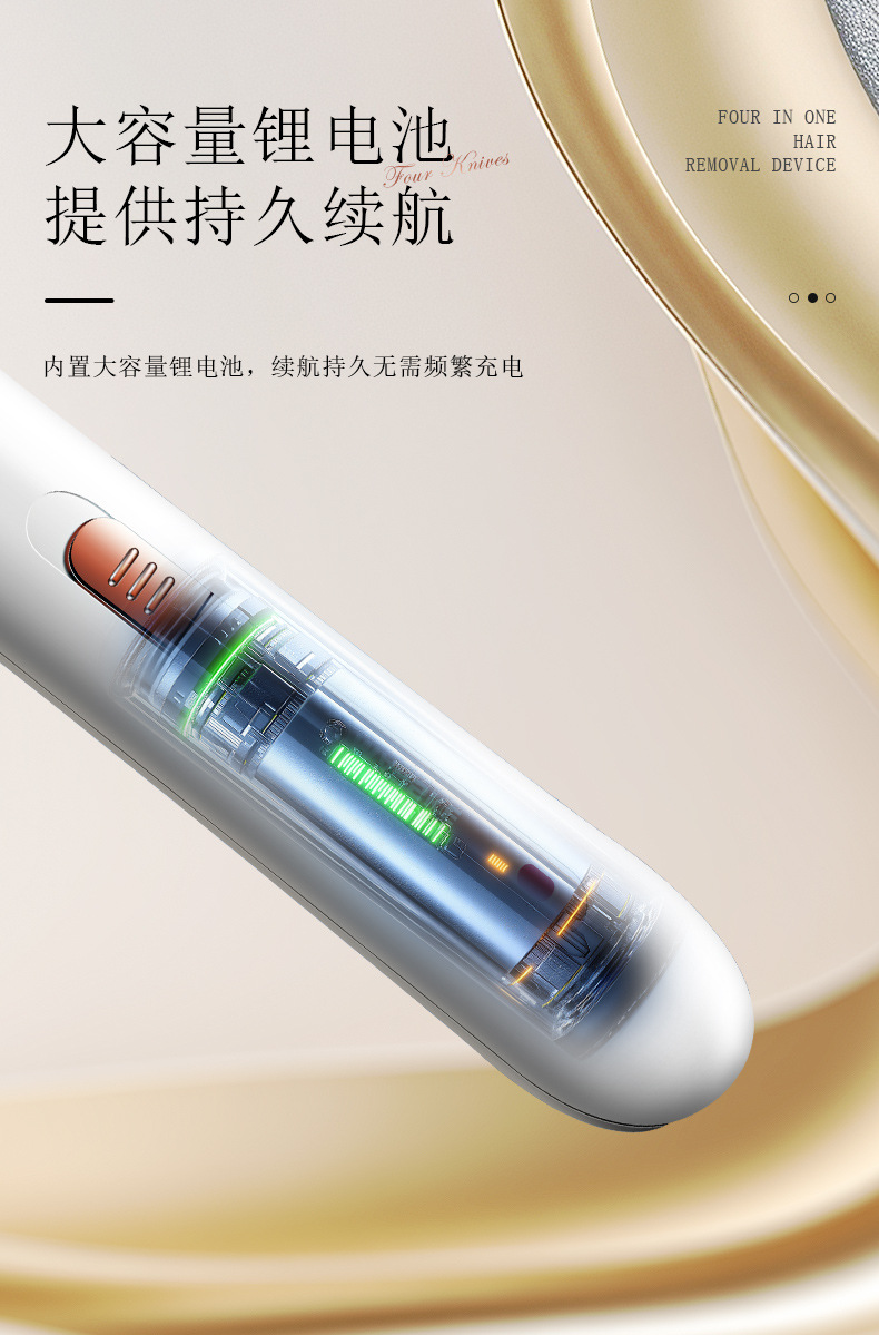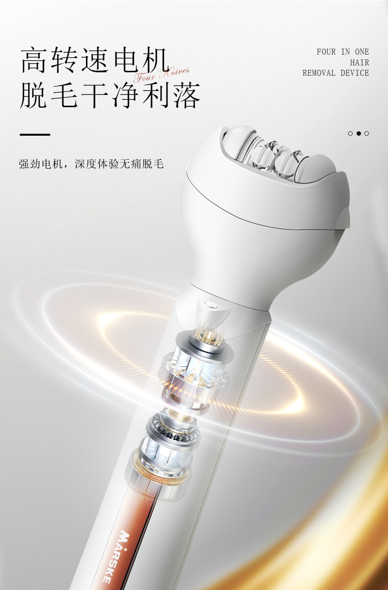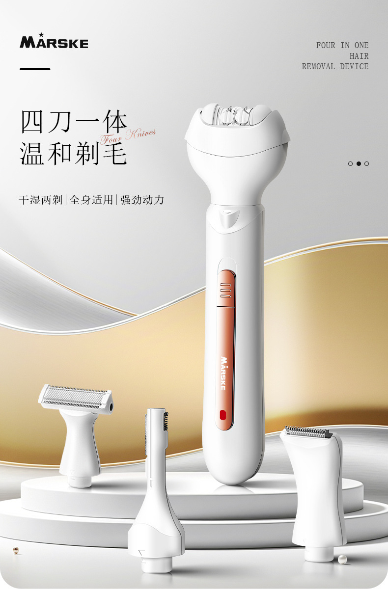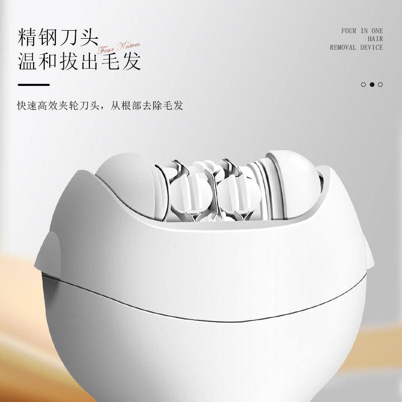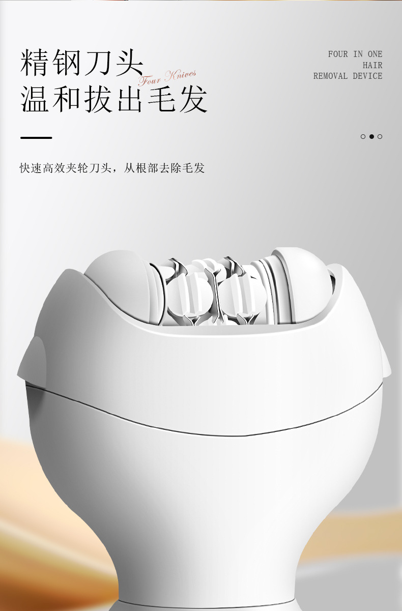 套装内含:脱毛器主机,剃毛刀头,T刀剃毛头,修眉头、鬓发刀头,,充电线, 英文说明书