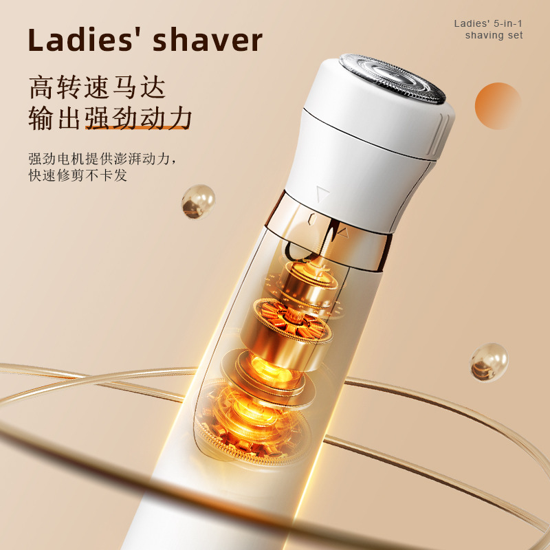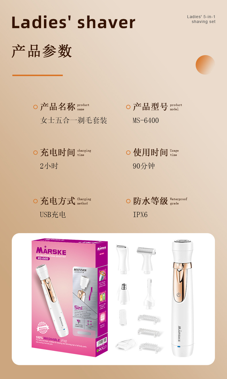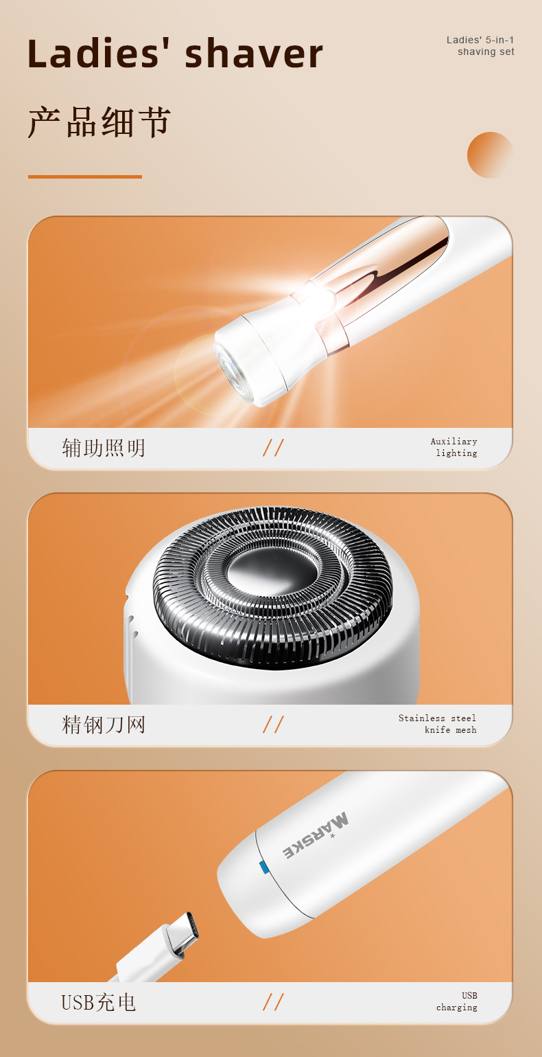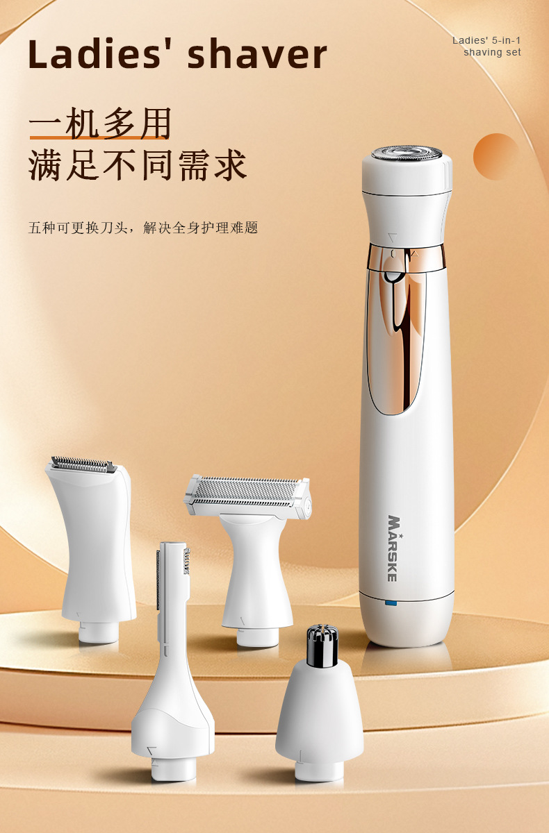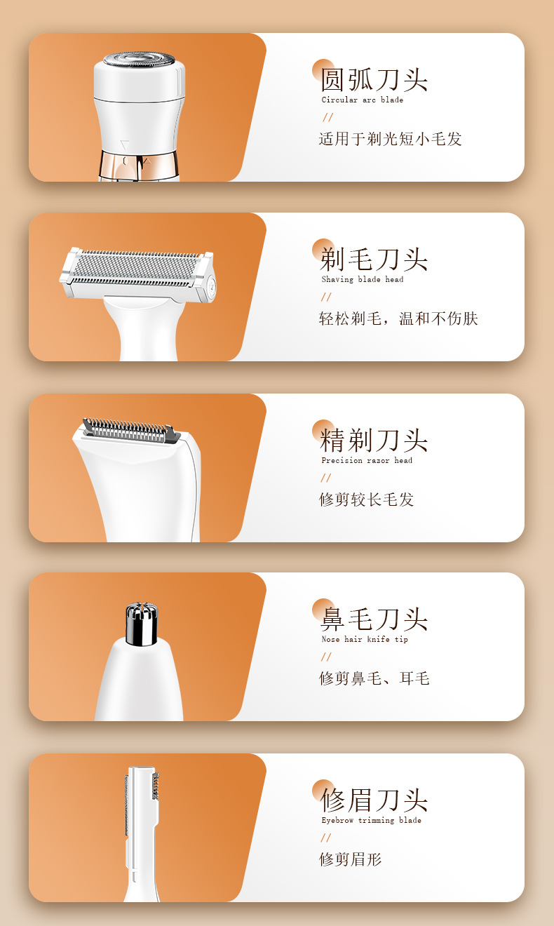 套装内含:剃毛器主机一个,刮毛刀头, 鬓发刀头,鼻毛刀头,修眉刀头,清洁刷,USB充电线,英文说明书