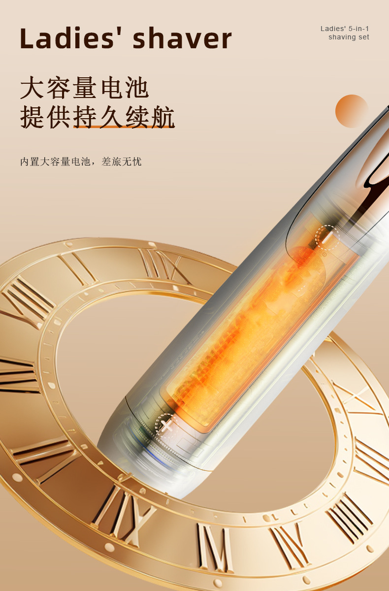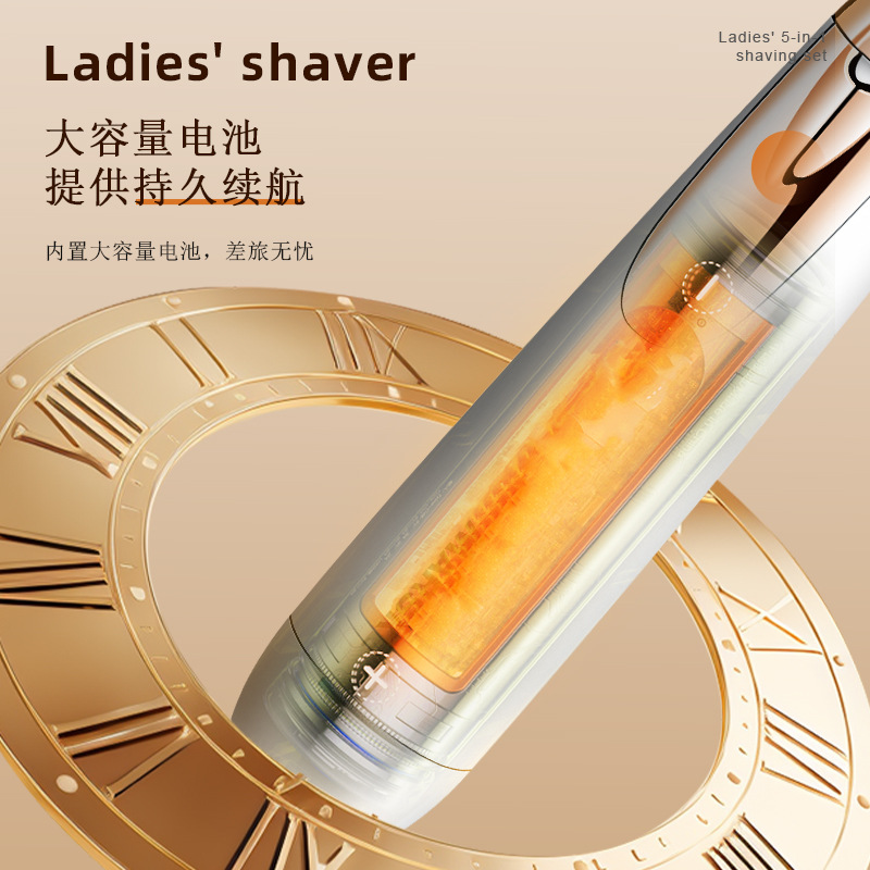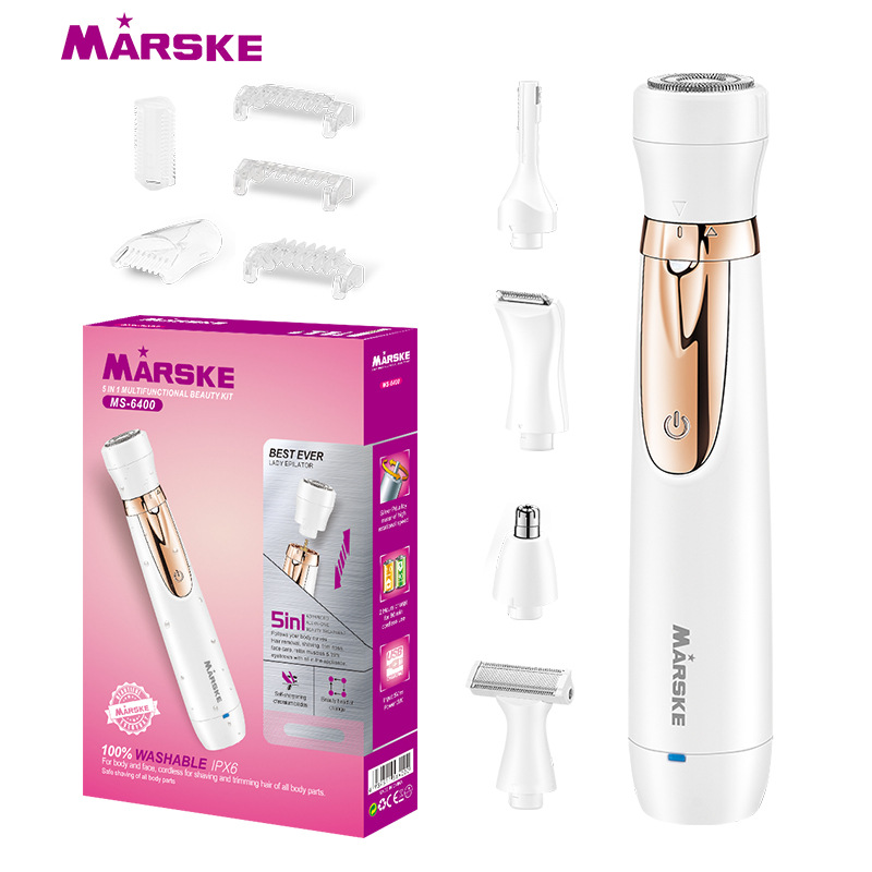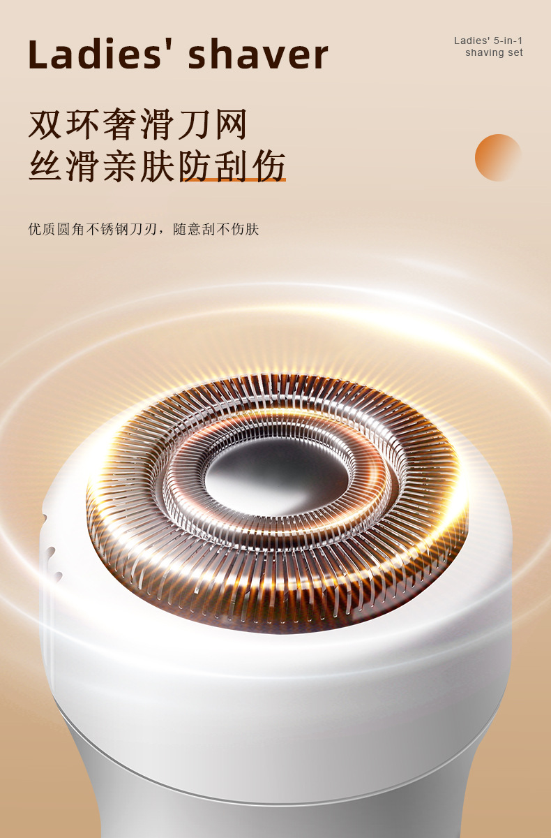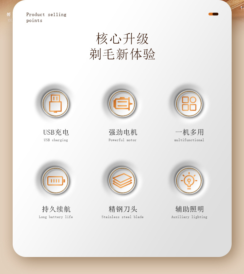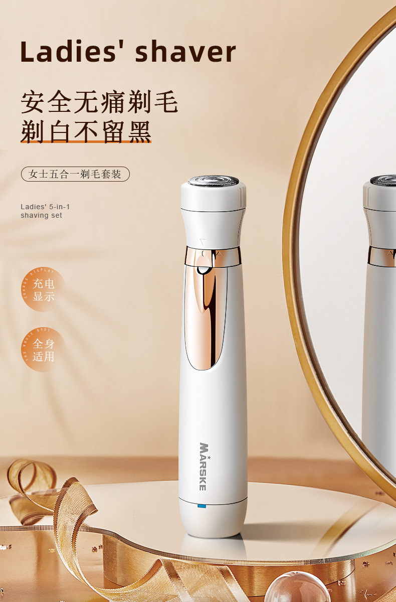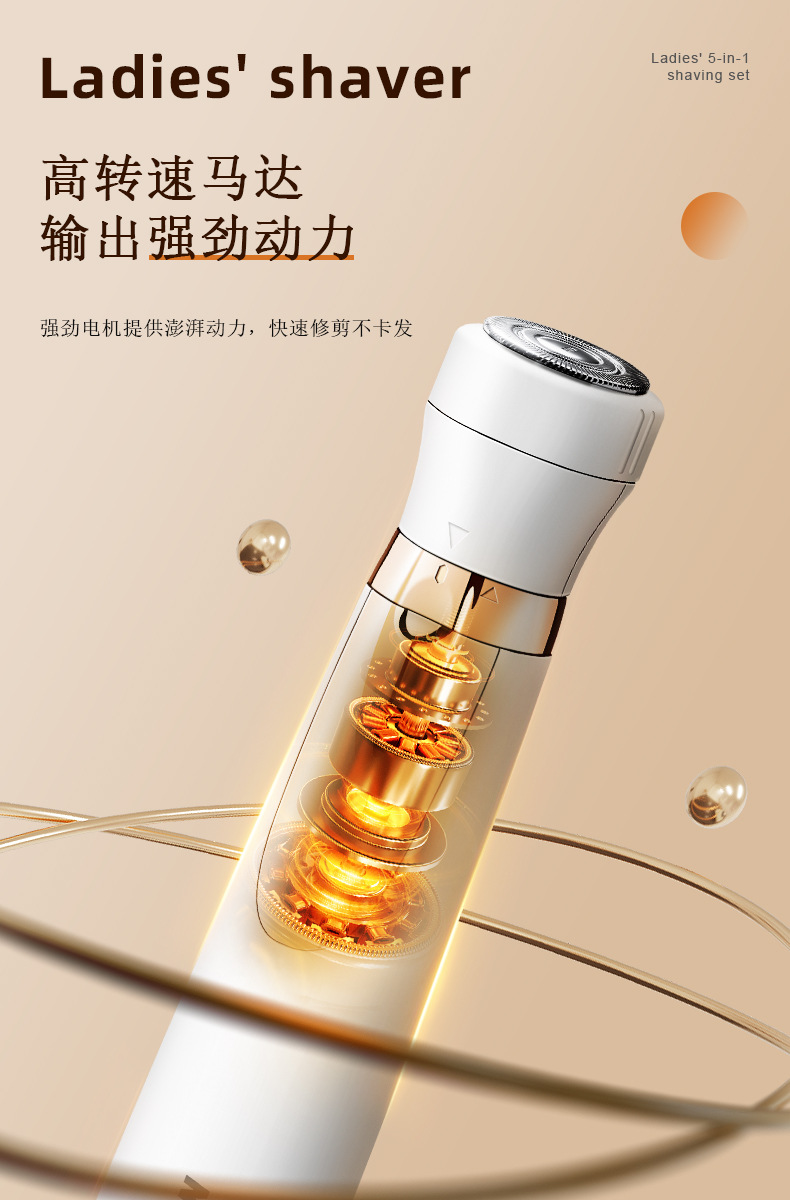 套装内含:剃毛器主机一个,刮毛刀头, 鬓发刀头,鼻毛刀头,修眉刀头,清洁刷,USB充电线,英文说明书