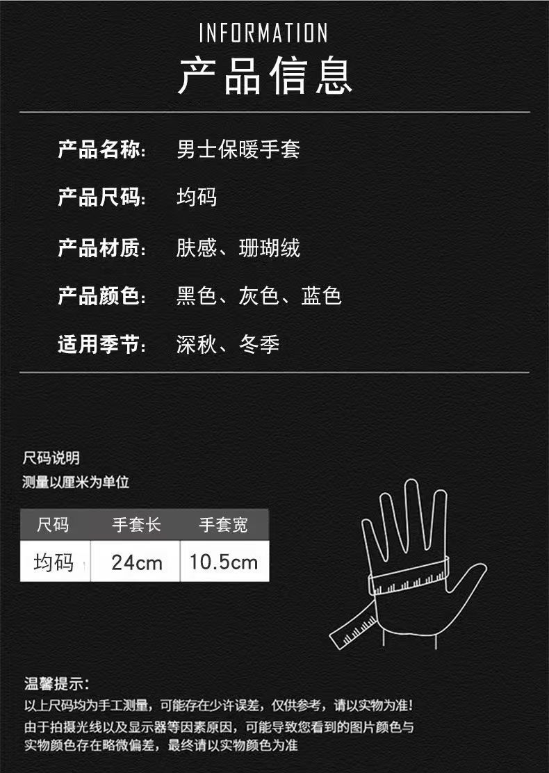品牌: 无 功能: 防滑,触屏,保暖,防风 货号: 防水男款保暖手套 款式: 分指手套 颜色: 肤感黑色,肤感灰色,肤感蓝色 尺码: 均码 有可授权的自有品牌: 否 是否跨境出口专供货源: 是 适合季节: 冬季 上市年份/季节: 2024年冬季 产地: 河北 风格: 商务,百搭,简约 面料名称: 防风肤感 风格分类: 时尚通勤 处理工艺: 绣花 产品类别: 保暖手套 流行元素分类: 自然 重量: 0.001 kg/双