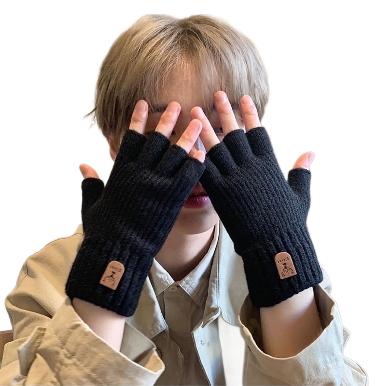 毛线针织手套男秋冬季露指学生写字打字骑行触屏保暖半指漏指弹性