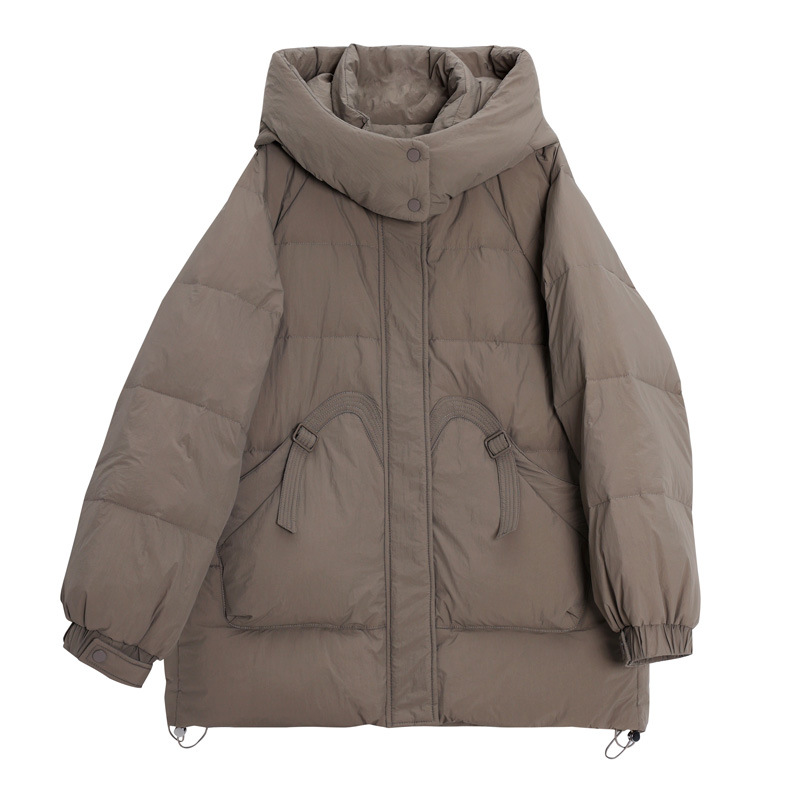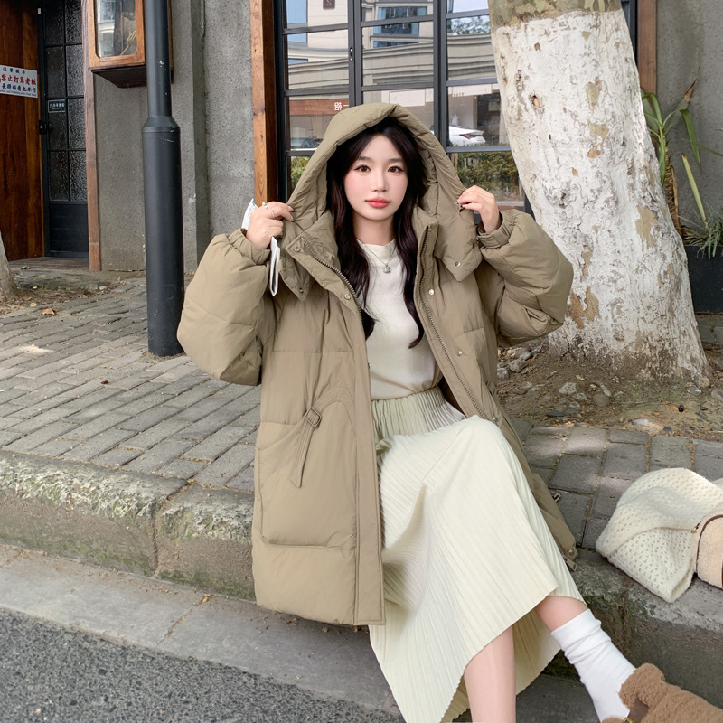 填充物: 白鸭绒 含绒量: 51%~55% 品牌: 冬晶佳圆 货号: D9902 厚薄: 厚 面料名称: 锦纶 主面料成分: 锦纶 版型: 宽松型 领型: 连帽 是否有毛领: 无毛领 是否可脱卸: 不可脱卸 衣长: 中长款(65cm<衣长≤80cm) 袖长: 长袖 流行元素: 口袋 门襟: 拉链 上市年份/季节: 2024年冬季 颜色: 栀子白,卡其棕,蜜桃粉,经典黑 风格类型: 气质通勤 主面料成分含量: 95%及以上 风格: 通勤风 重量: 0.001 kg/件