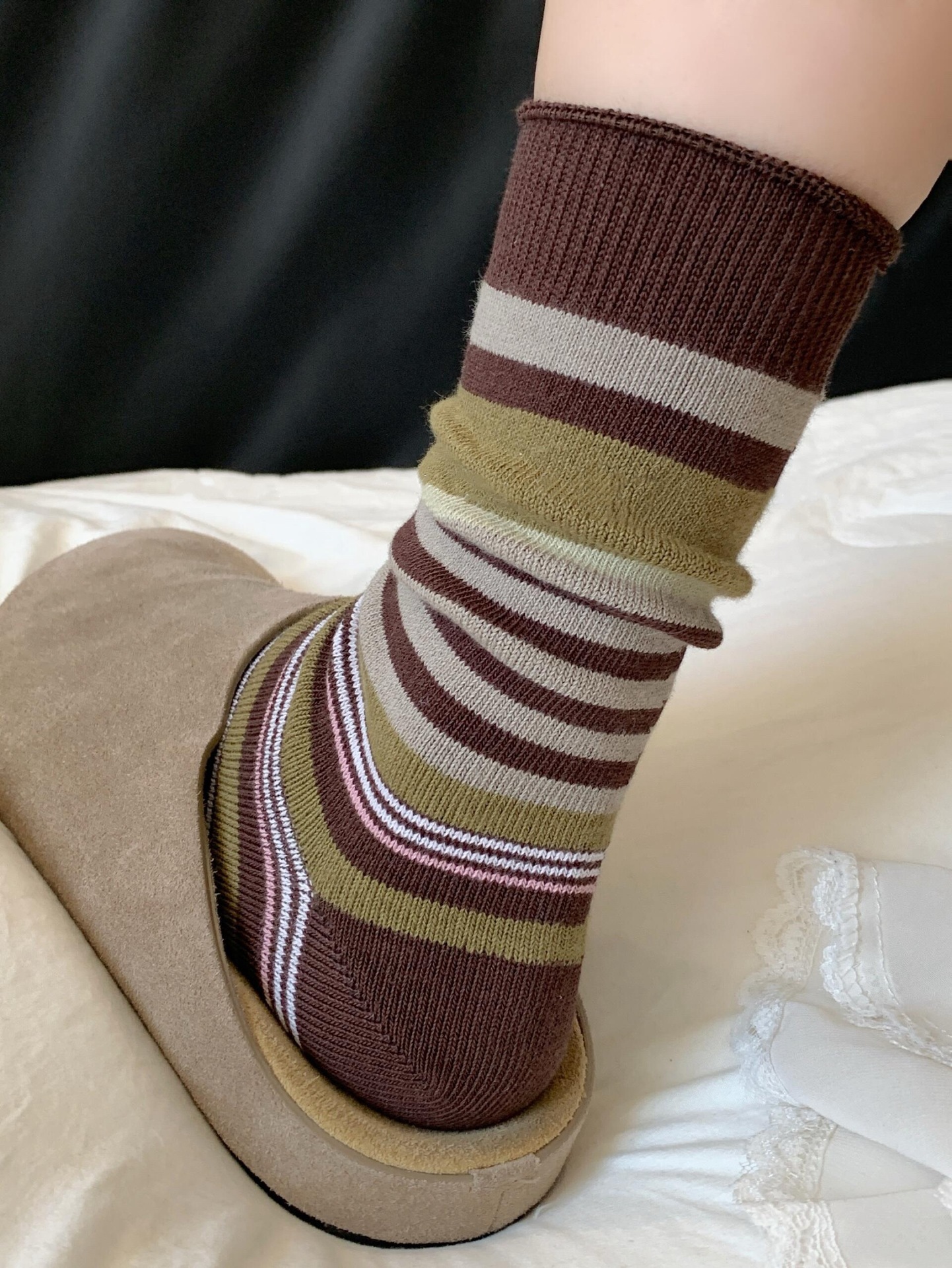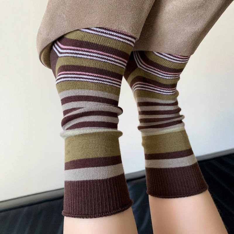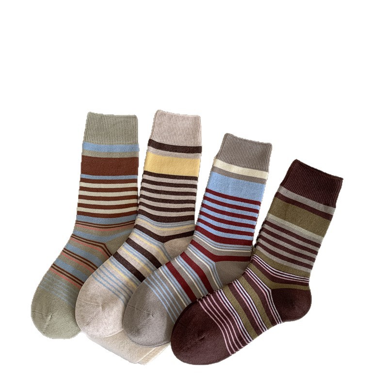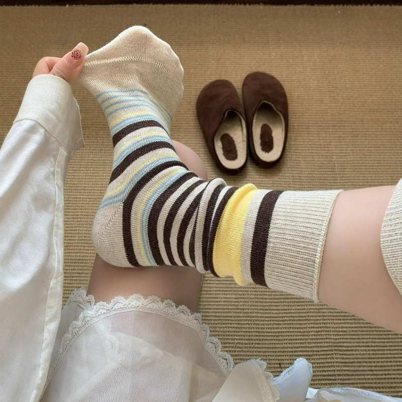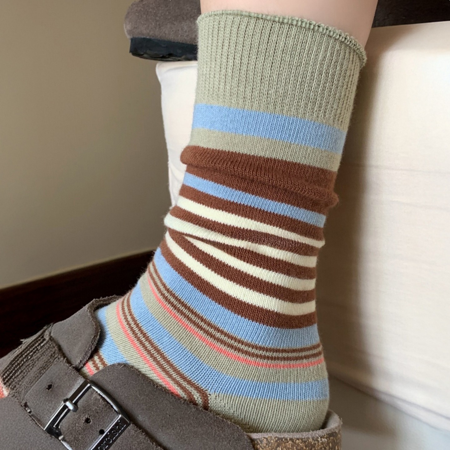韩版复古森系美拉德撞色条纹中筒袜子女透气秋冬勃肯鞋双针堆堆袜 English | 投诉