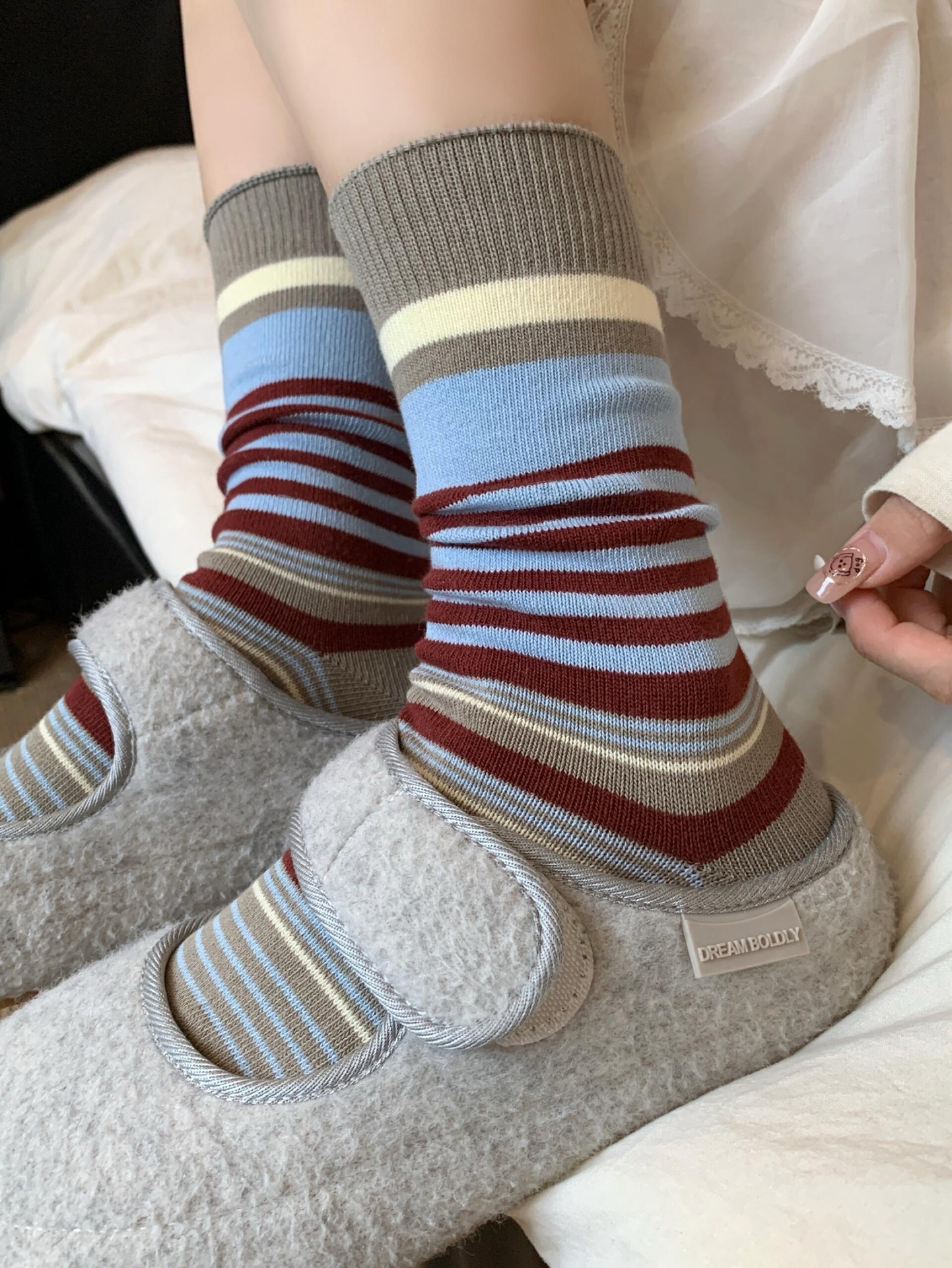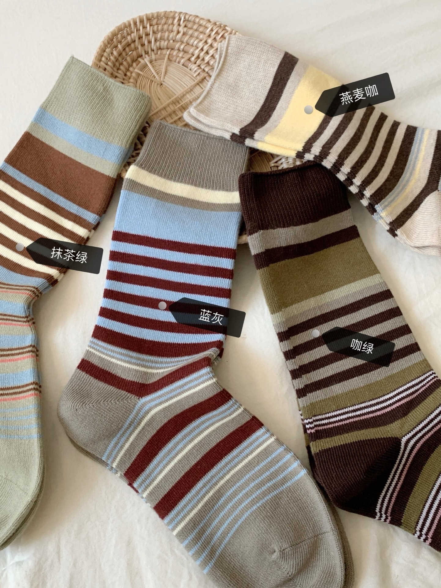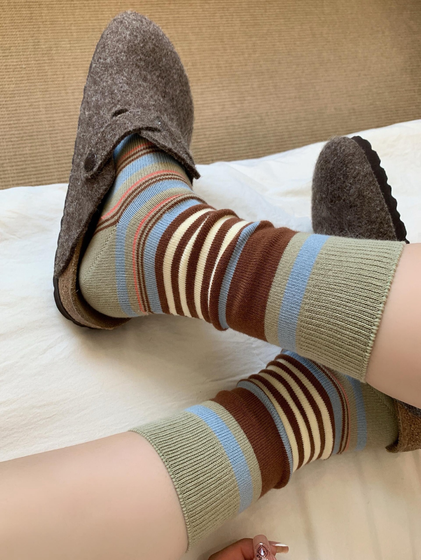 韩版复古森系美拉德撞色条纹中筒袜子女透气秋冬勃肯鞋双针堆堆袜 English | 投诉