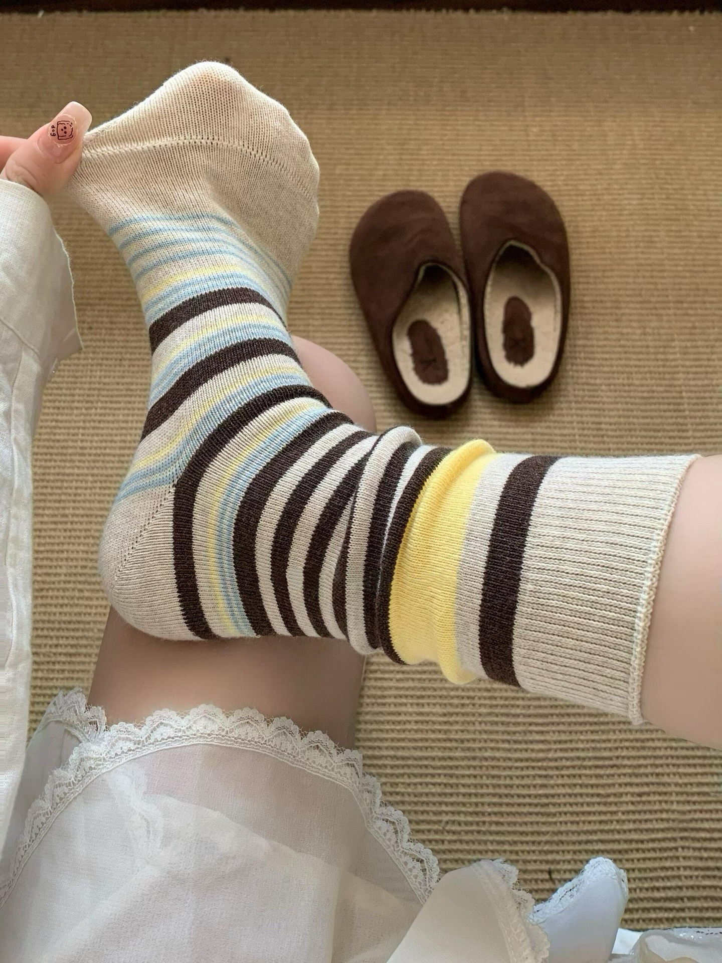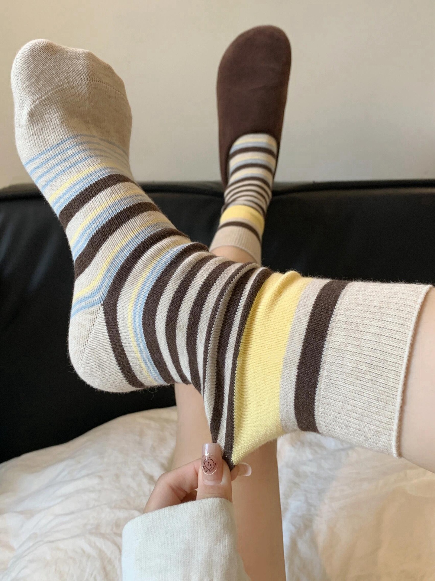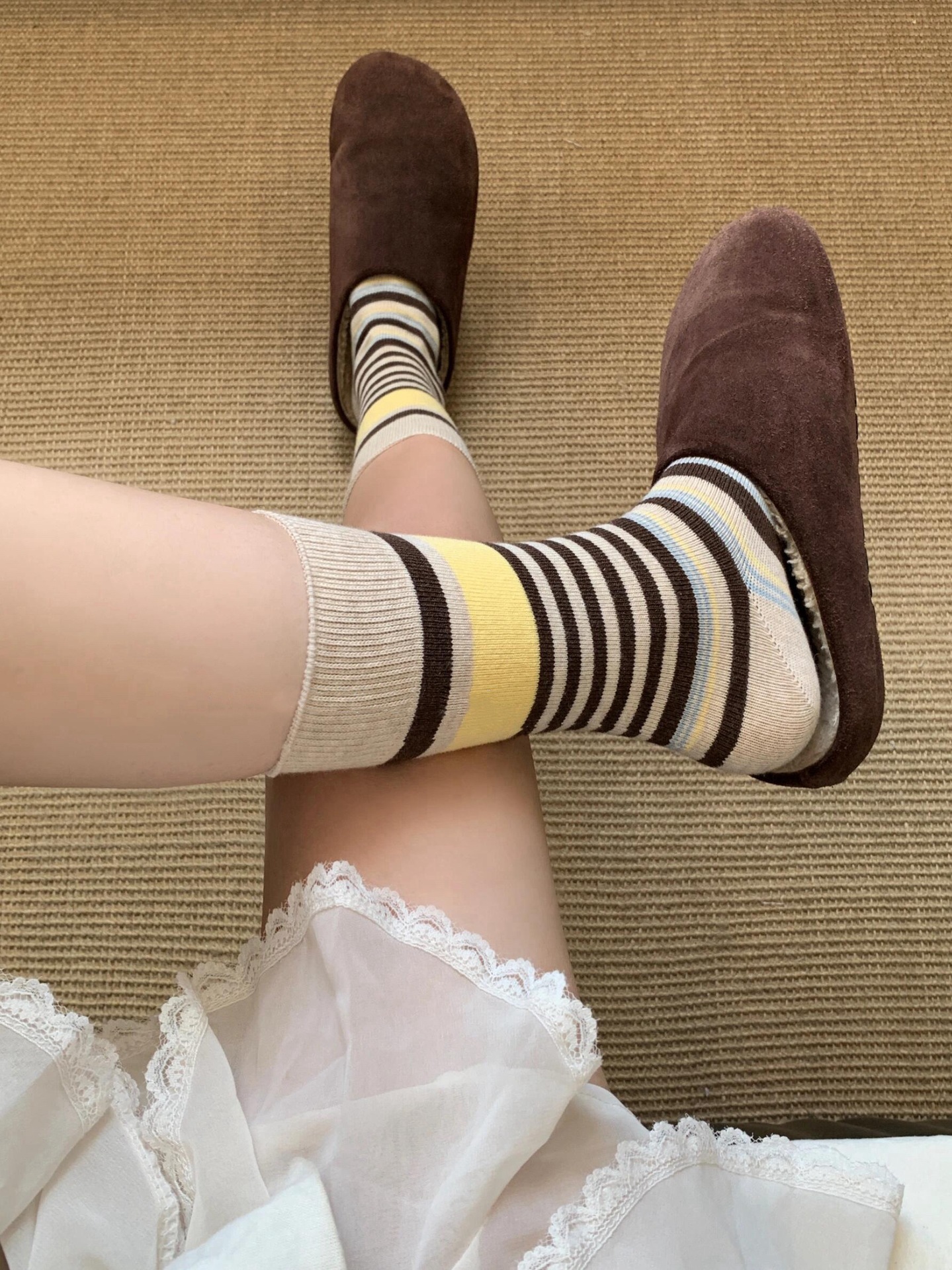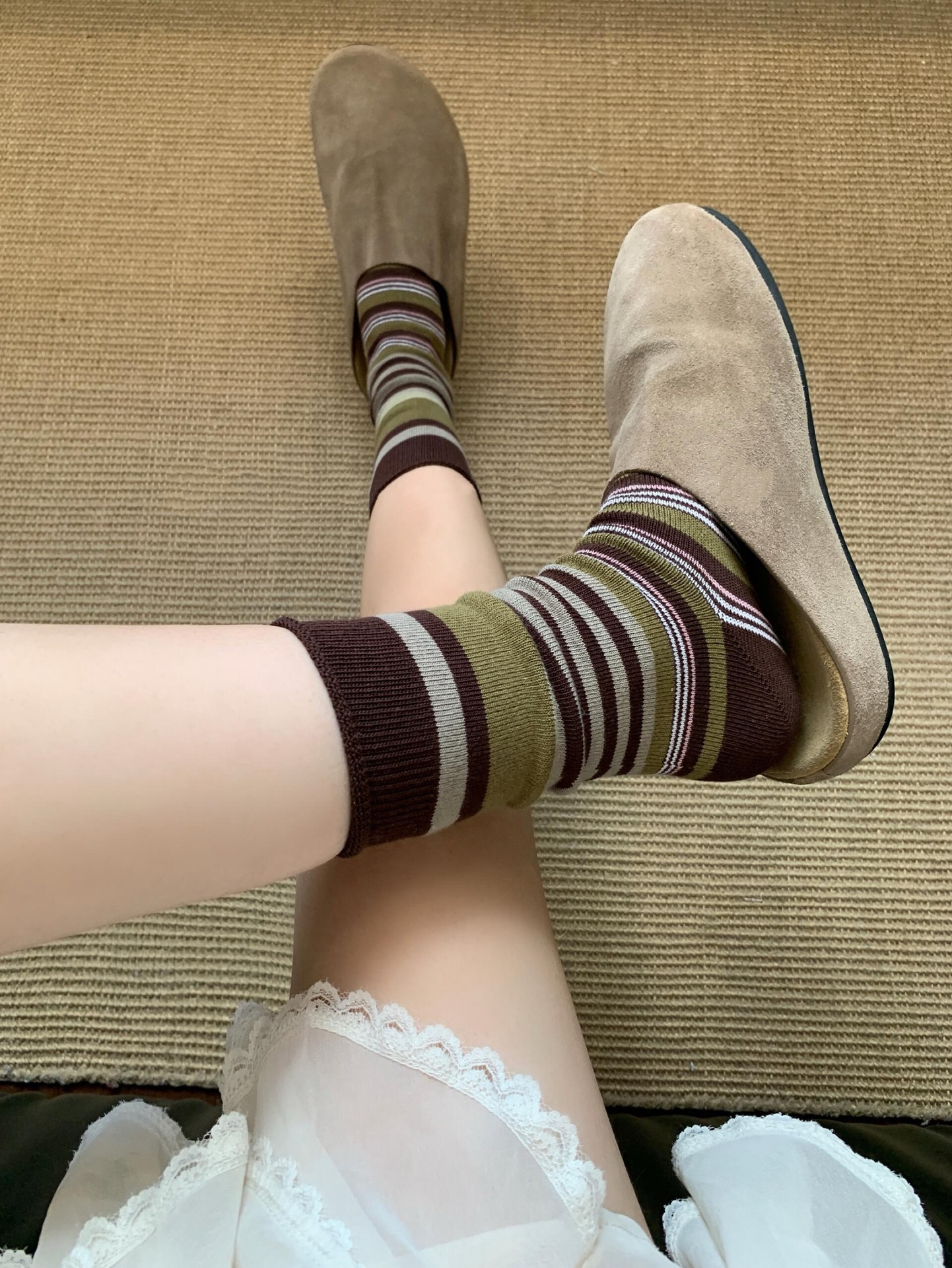 韩版复古森系美拉德撞色条纹中筒袜子女透气秋冬勃肯鞋双针堆堆袜 English | 投诉