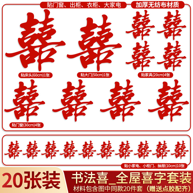 结婚布置大小喜字贴房门套装专用卧室入户门窗户楼梯贴纸婚房装饰喜字贴结婚专用喜字婚房布置囍字贴纸红双喜贴门套装婚庆用品批发