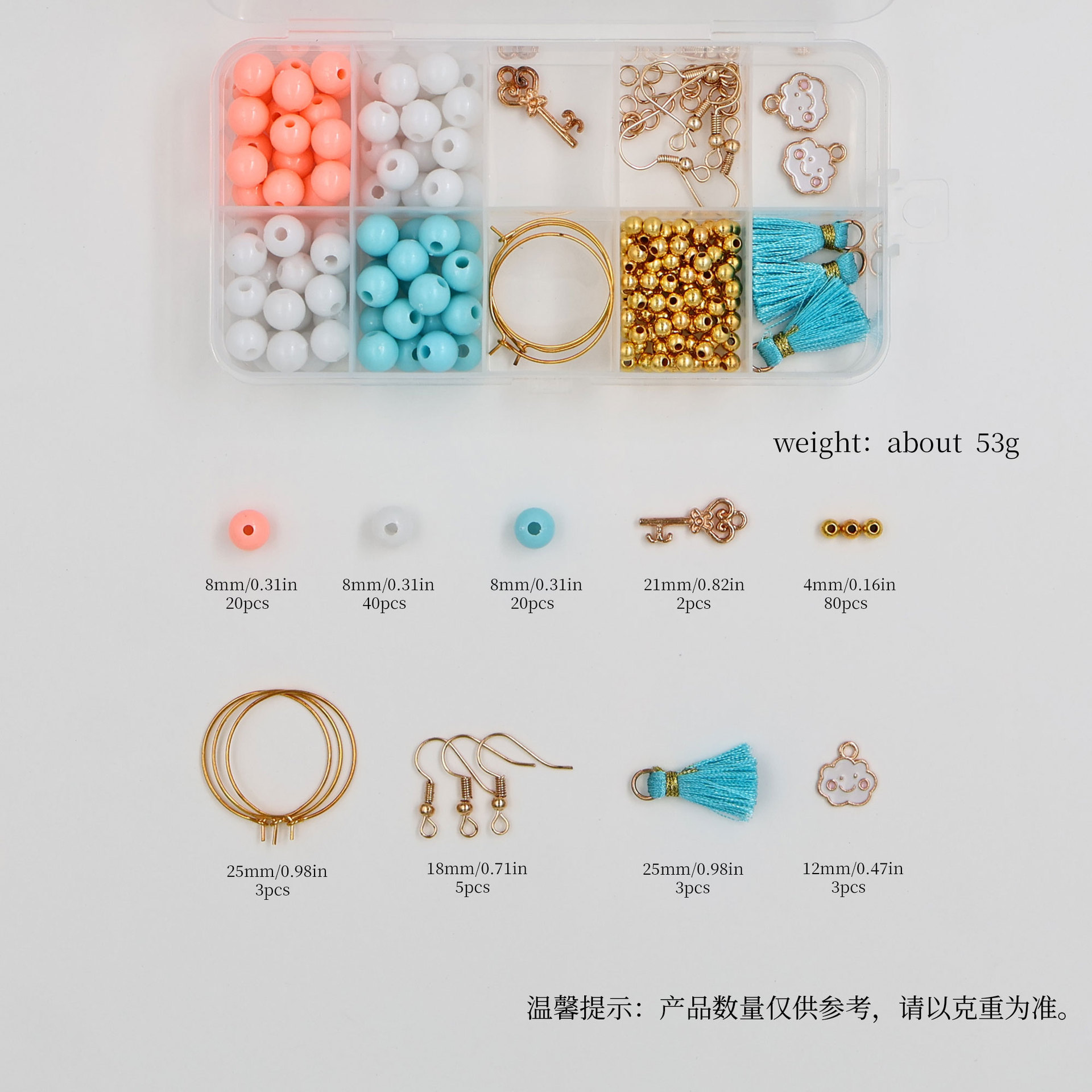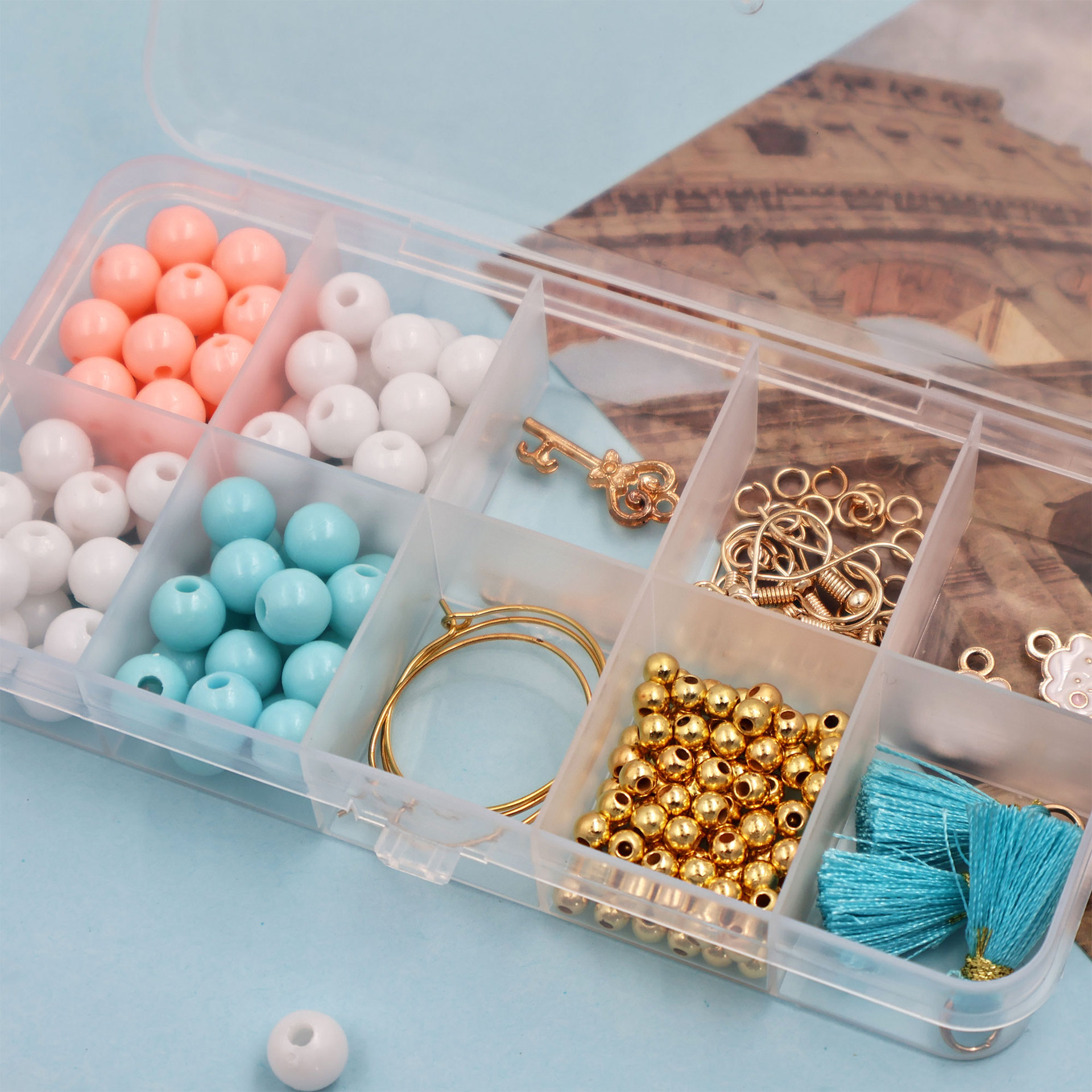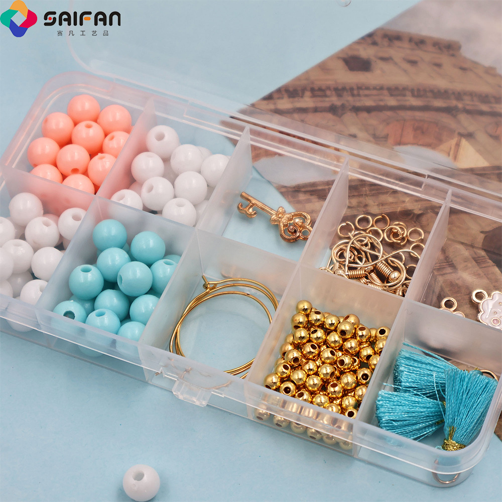 种类: diy饰品配件 材质: 合金 处理工艺: 电镀 货号: SF-805 产地: 义乌 品牌: SAIFAN DIY 颜色: 10格串珠套装+捆装线约176pcs 主要下游平台: 亚马逊,SHEIN 有可授权的自有品牌: 是 是否跨境出口专供货源: 是 流行元素: 无 上市年份/季节: 2024年夏季 风格: 原创设计 风格分类: 原创设计 主要销售地区: 北美,东北亚,中东,其他 流行元素分类: 无 重量: 0.1 kg/箱