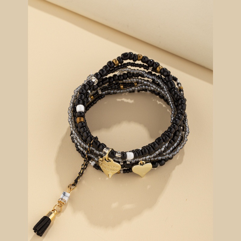 跨境爆款合金桃心吊坠时尚流苏米珠手链 暗色系多层叠戴米珠手串