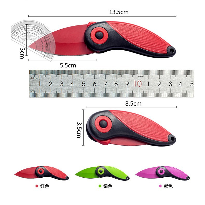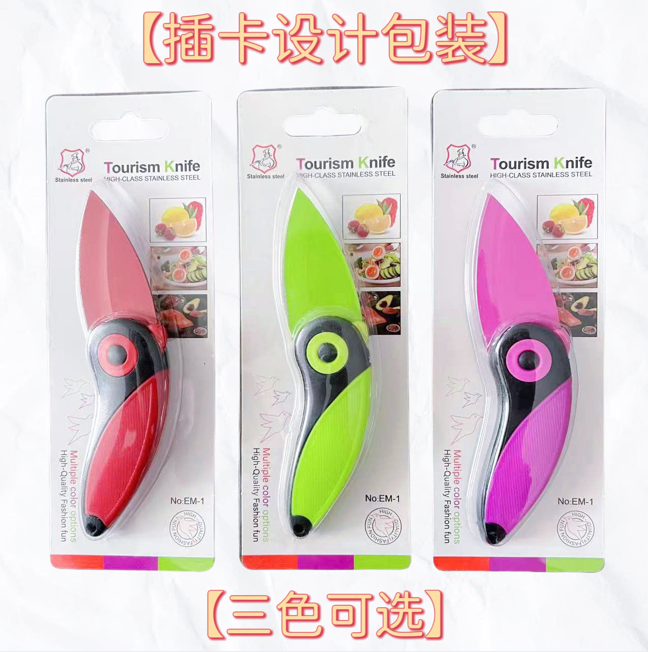 产地: 广东阳江 货号: EM-1 品牌: 联铧 产品类别: 折叠水果刀 价格段: 5元以内 材质: 不锈钢 是否有专利: 否 规格: 红色插卡包装,绿色插卡包装,粉色插卡包装 原产国/地区: 中国广东 是否进口: 否 是否跨境出口专供货源: 是 风格: 现代简约 主要销售地区: 非洲,欧洲,南美,东南亚,北美,东北亚, 主要下游平台: ebay,亚马逊,wish,速卖通,独立 有可授权的自有品牌: 否 版权: 无 刀尖角度: 60°以下 刃长: 5.5cm 刀身材质: 3Cr系列钢 刀柄长: 8.5cm 重量: 0.1 kg/把