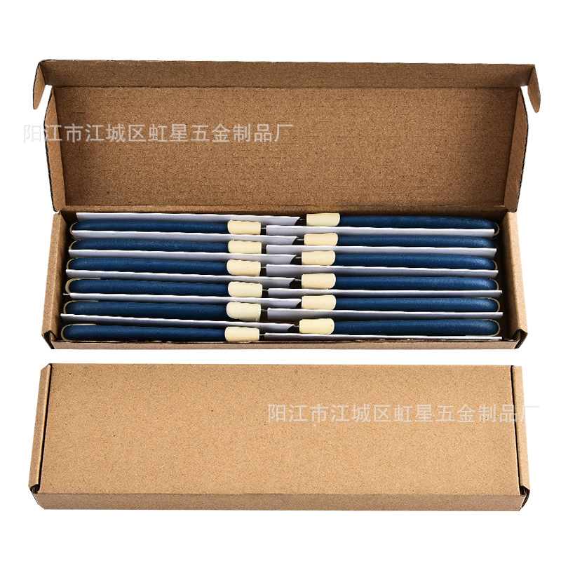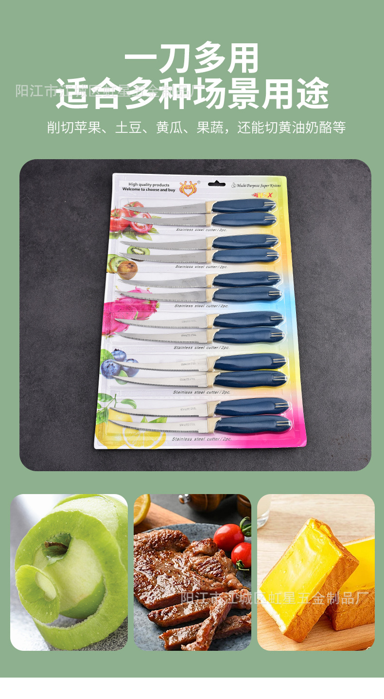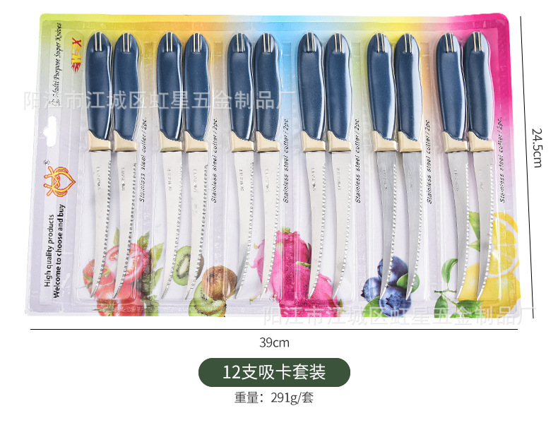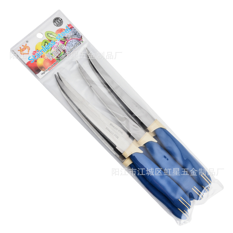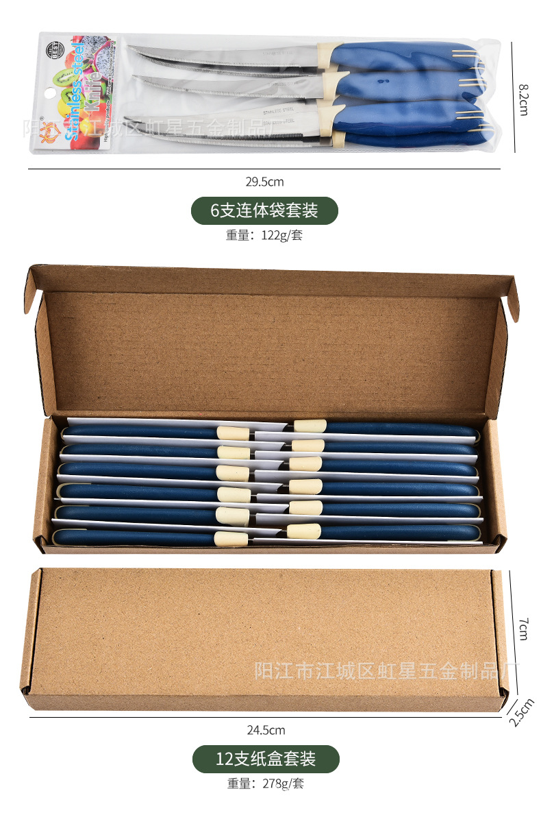 产地: 阳江 货号: HX041 品牌: 虹星 产品类别: 牛扒刀/蔬菜刀 价格段: 1元以内 材质: 不锈钢 是否有专利: 否 规格: 深蓝色,定制颜色/LOGO-请联系客服, 原产国/地区: 广东阳江 是否进口: 否 是否跨境出口专供货源: 是 风格: 英伦 主要销售地区: 非洲,欧洲,南美,东南亚,北美,东北亚, 主要下游平台: 亚马逊,wish,速卖通,独立站,LAZ 有可授权的自有品牌: 否 版权: 无 刀尖角度: 60°以下 刃长: 12.5 刀身材质: 2Cr系列钢 刀柄长: 10 重量: 0.1 kg/套