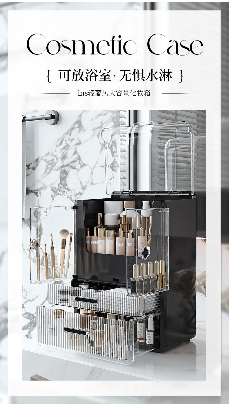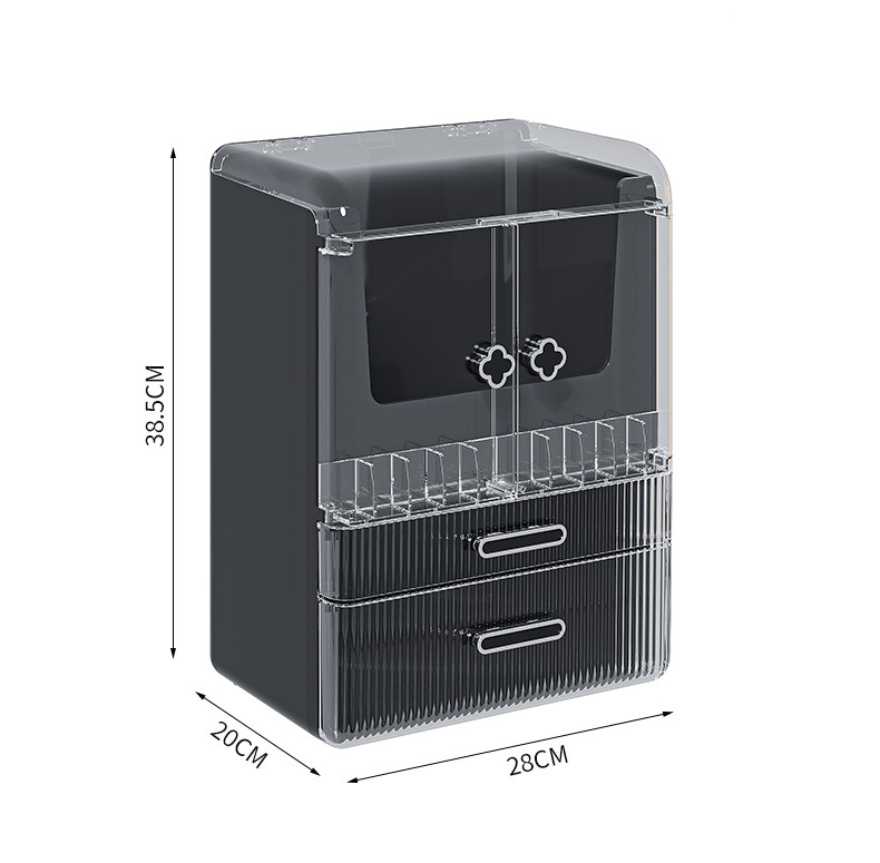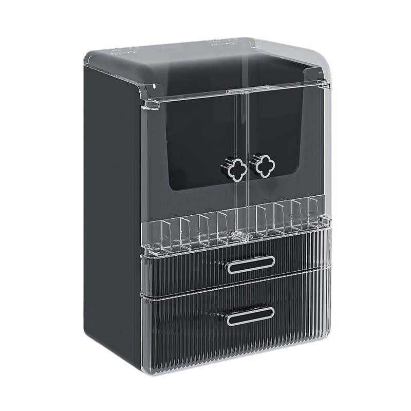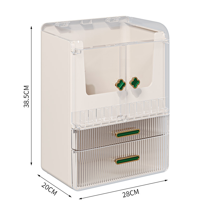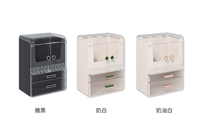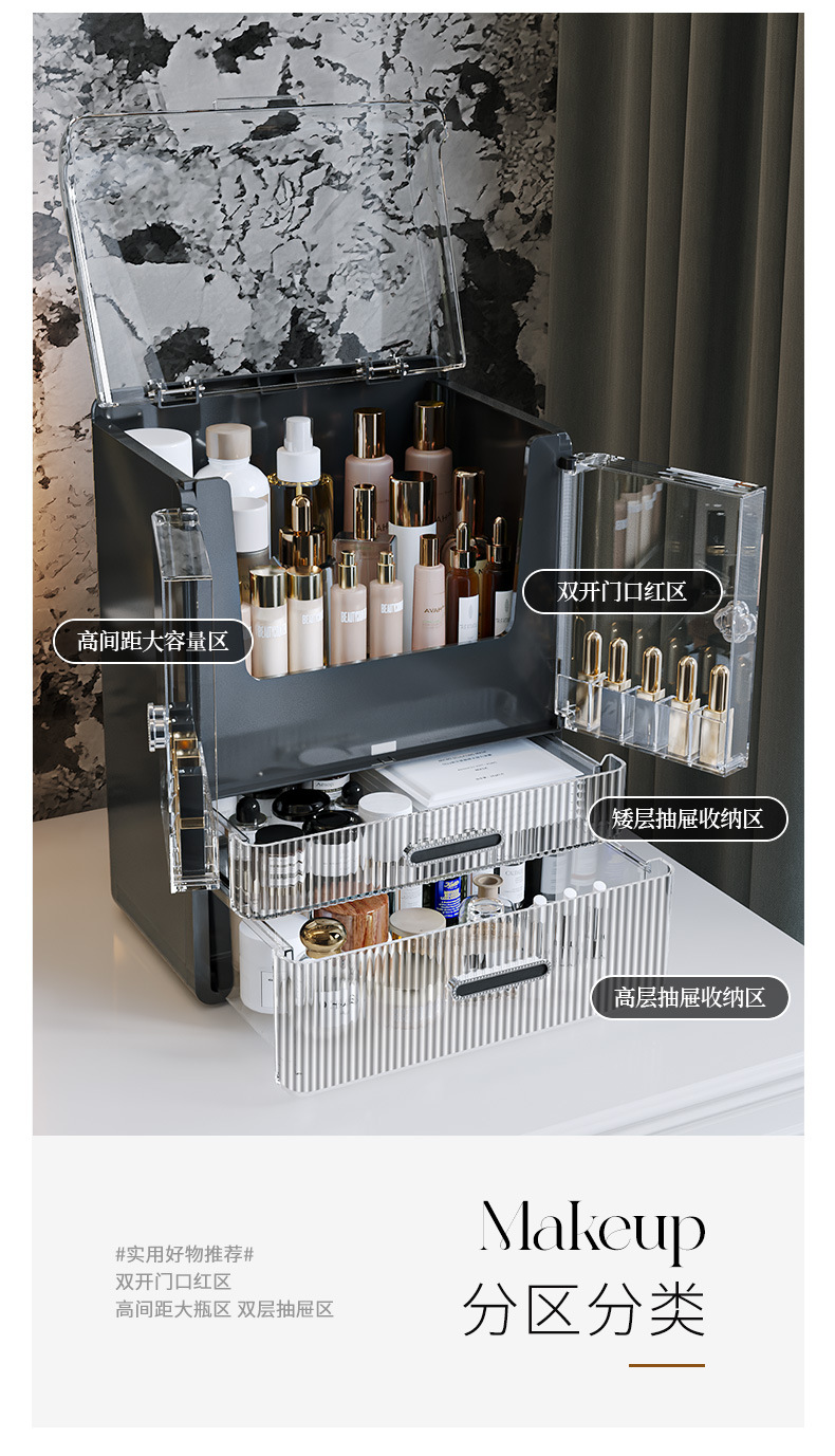高级化妆品收纳盒桌面口红化妆刷护肤品置物架梳妆台双开门化妆箱 English | 投诉