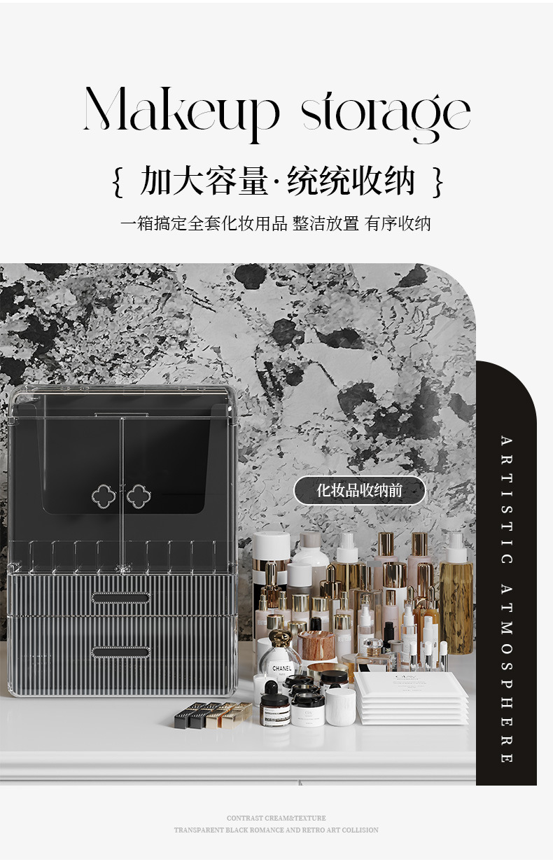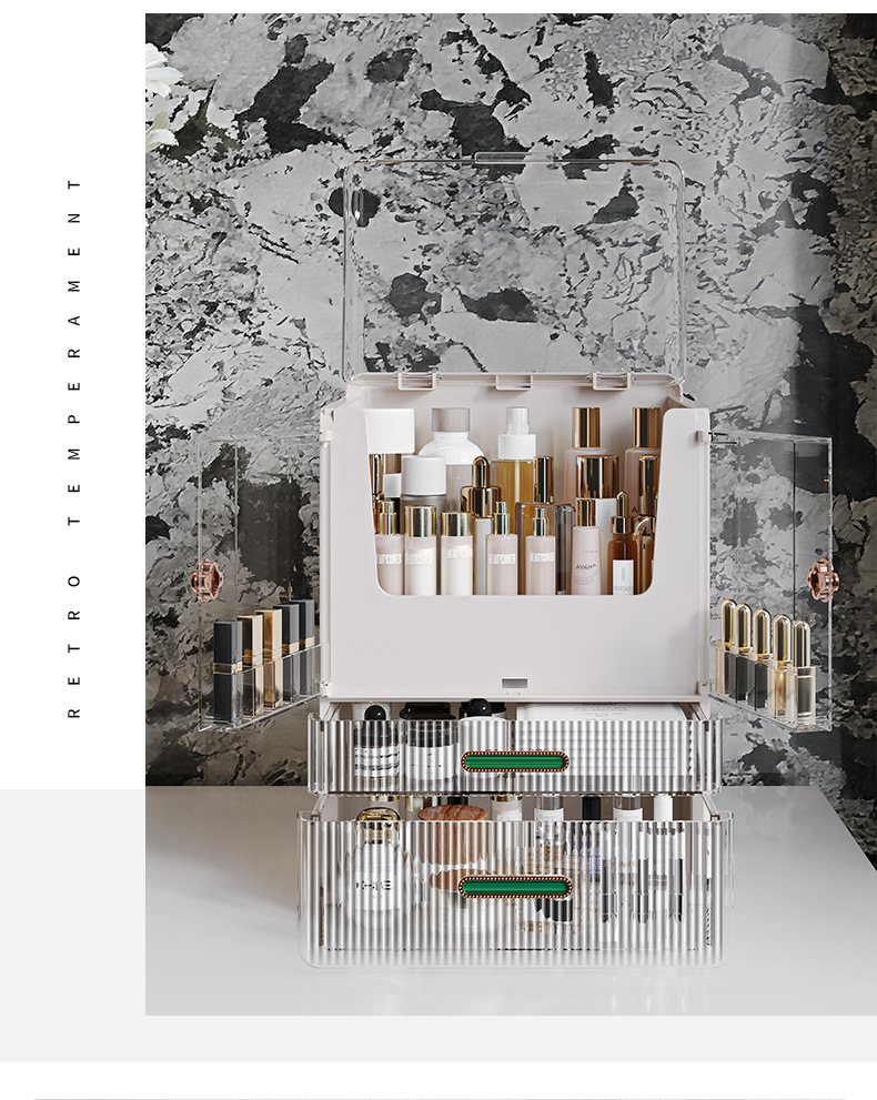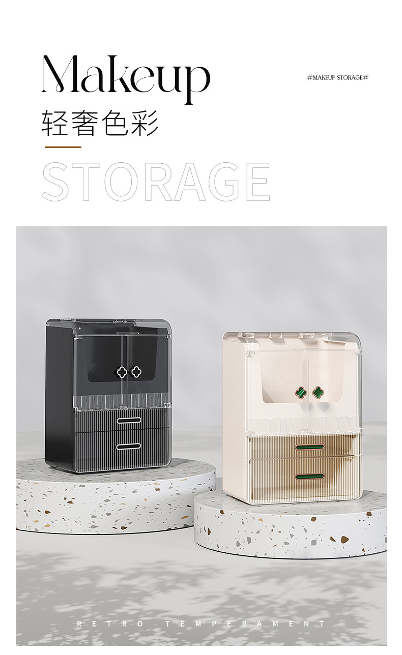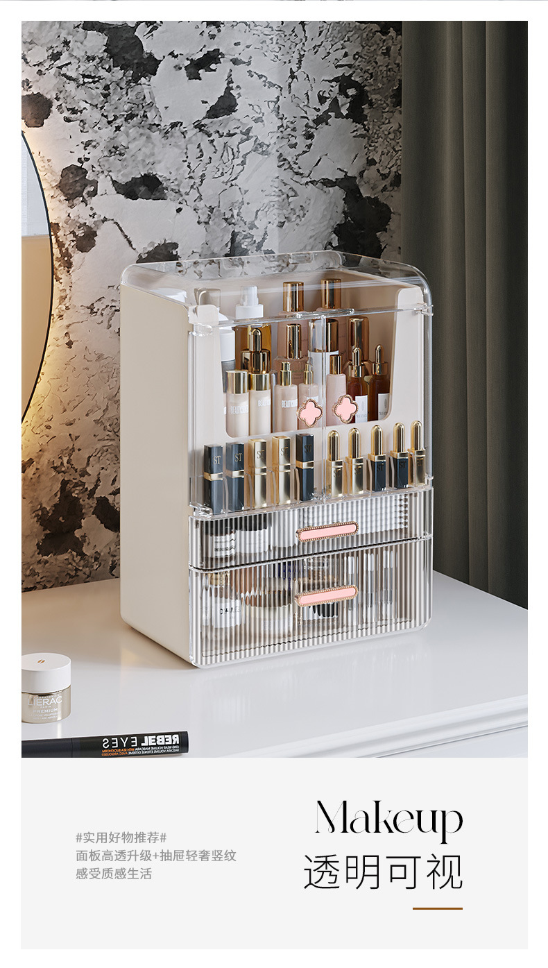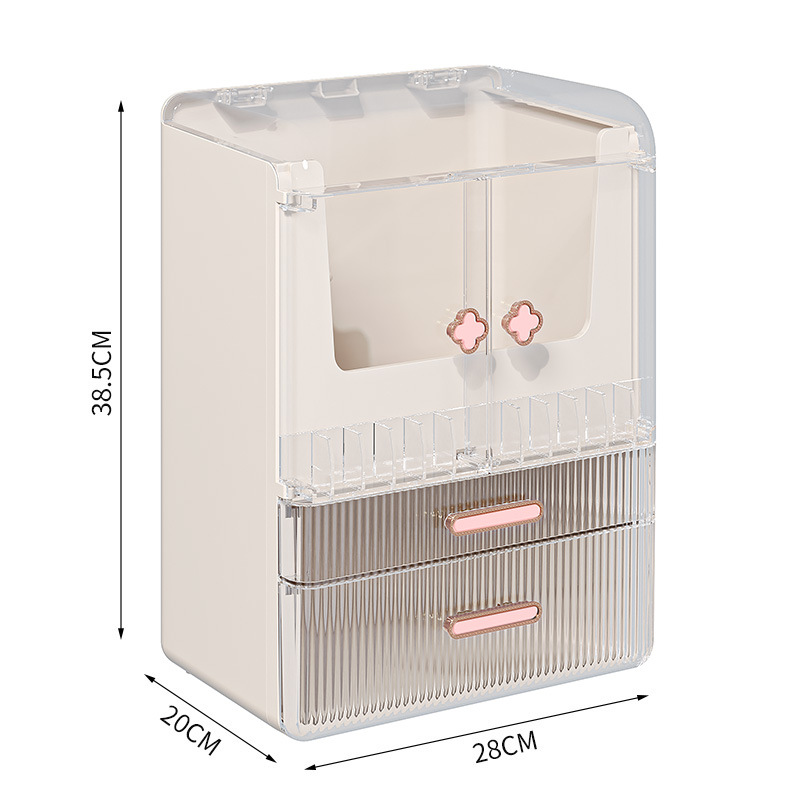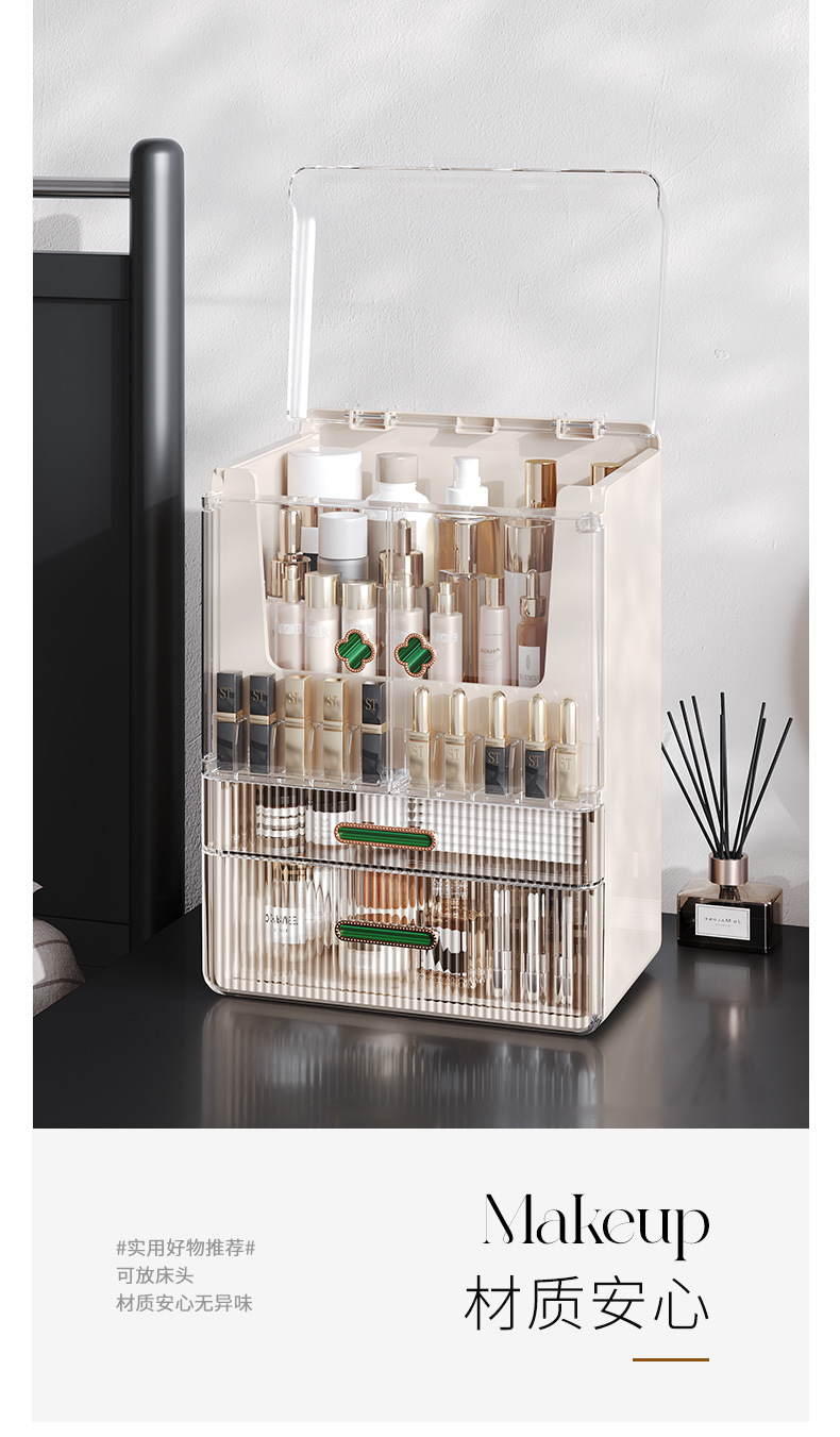 高级化妆品收纳盒桌面口红化妆刷护肤品置物架梳妆台双开门化妆箱 English | 投诉