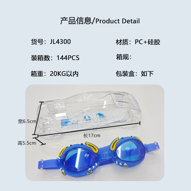 品牌: JL 货源类别: 现货 货号: JL4300 产品类别: 普通泳镜 镜片材质: PC 适用人群: 儿童 是否外贸: 是 颜色: 天蓝色,蓝色,粉红色,橙色 是否跨境出口专供货源: 否 儿童专用: 否