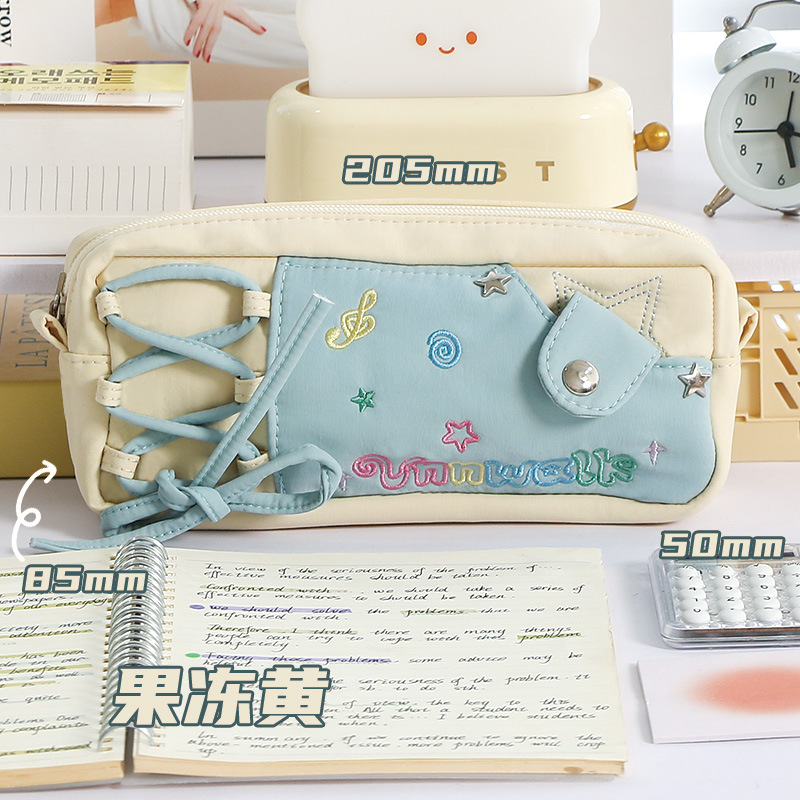 货号: 多巴胺撞色牛仔痛层笔袋 材质: 织布 性别: 通用 颜色: 音符牛仔,黄蓝,粉白 是否IP授权: 否 风格: 韩版