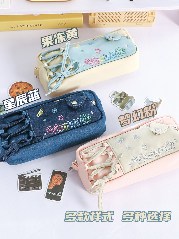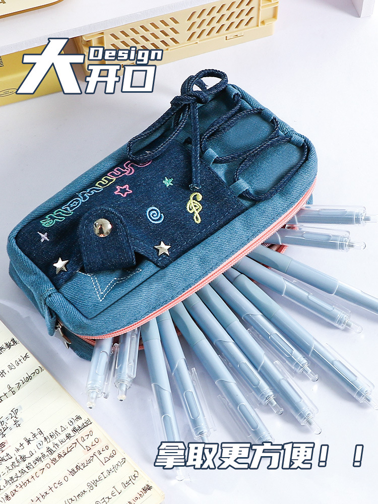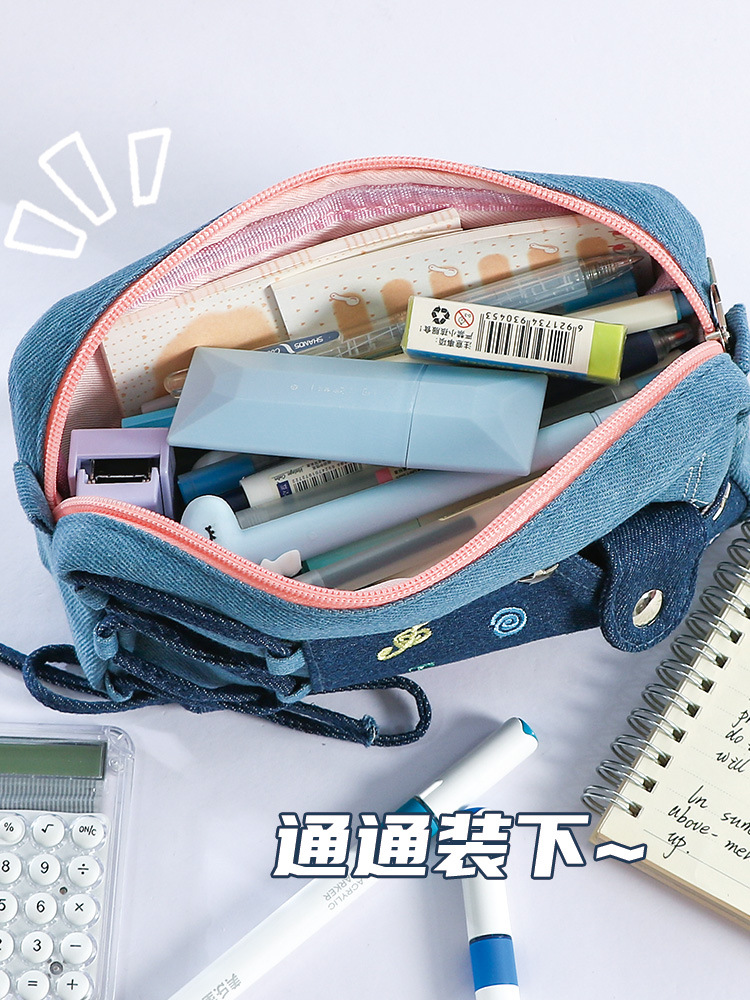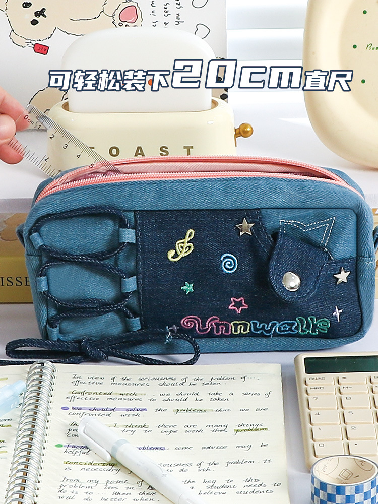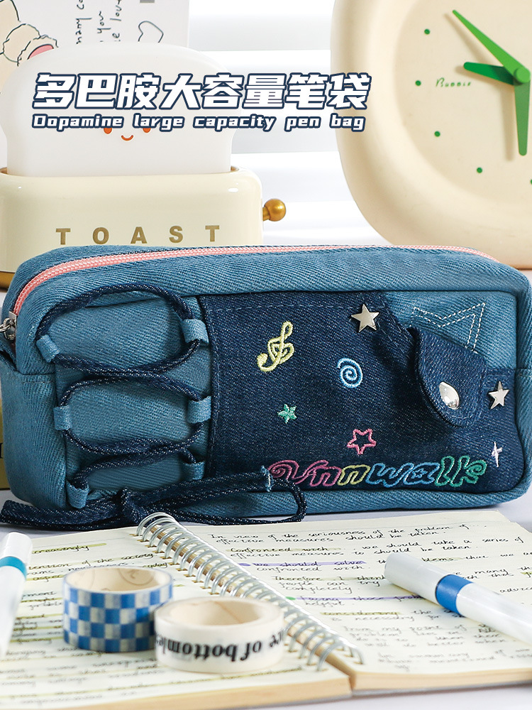 新款多巴胺撞色牛仔痛层笔袋耐脏小众设计感大容量文具袋