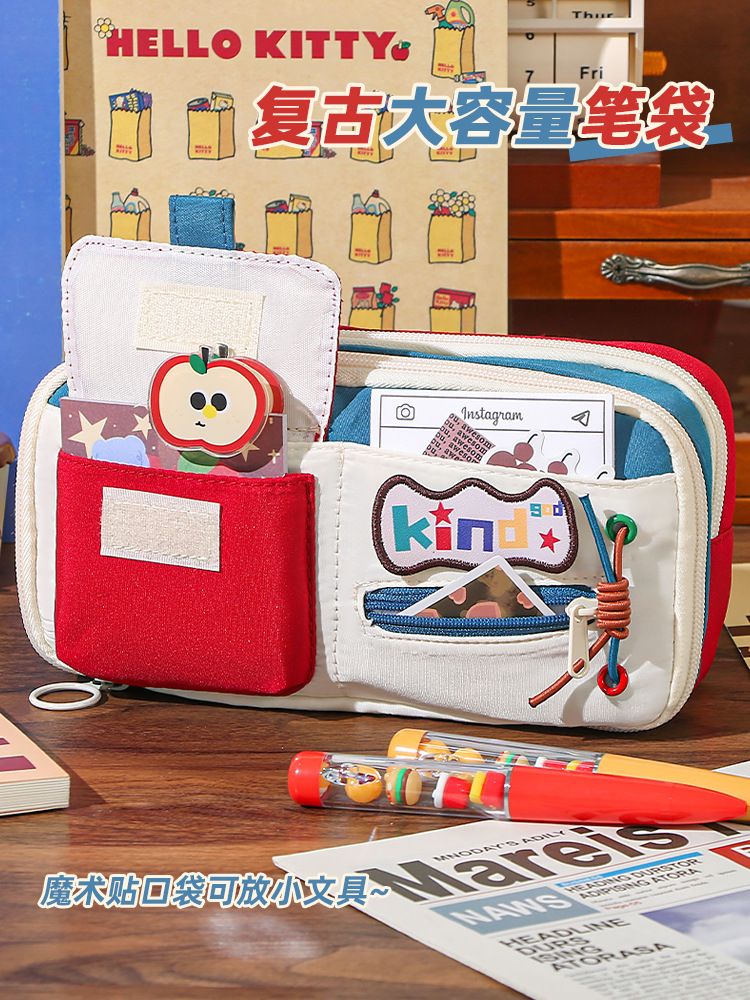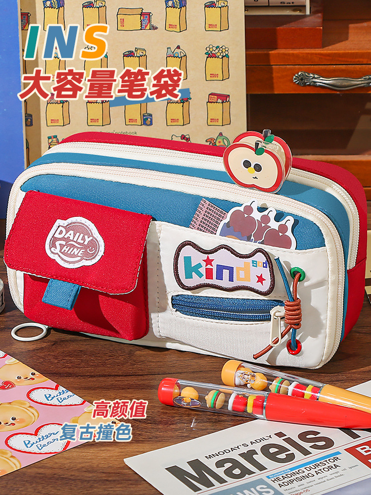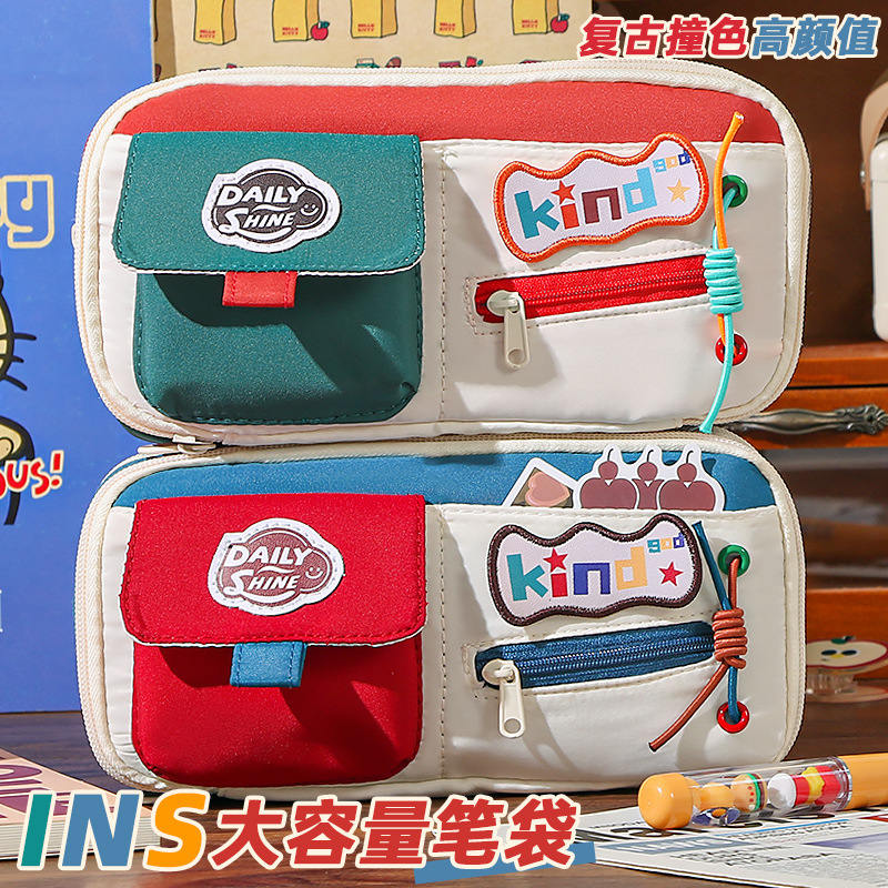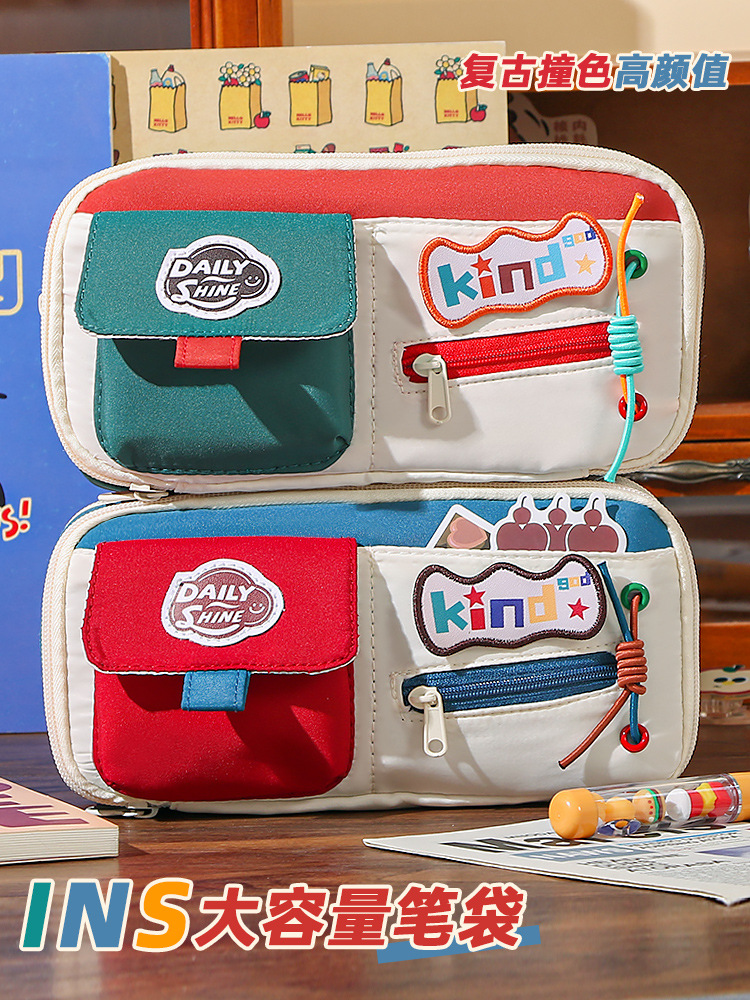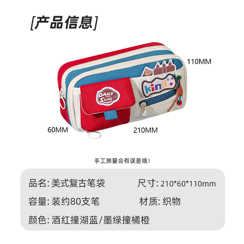 新款大容量美式复古撞色笔袋小众耐脏高颜值多功能文具收纳袋 投诉