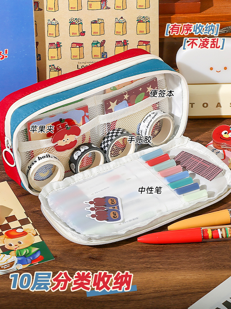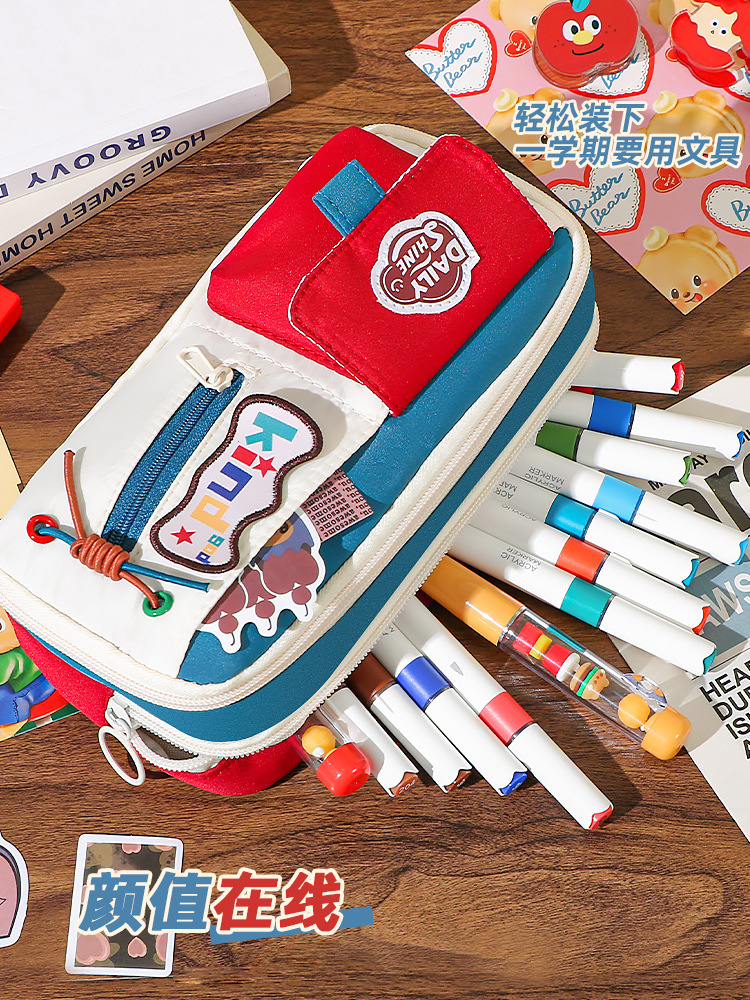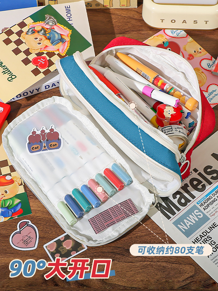 新款大容量美式复古撞色笔袋小众耐脏高颜值多功能文具收纳袋